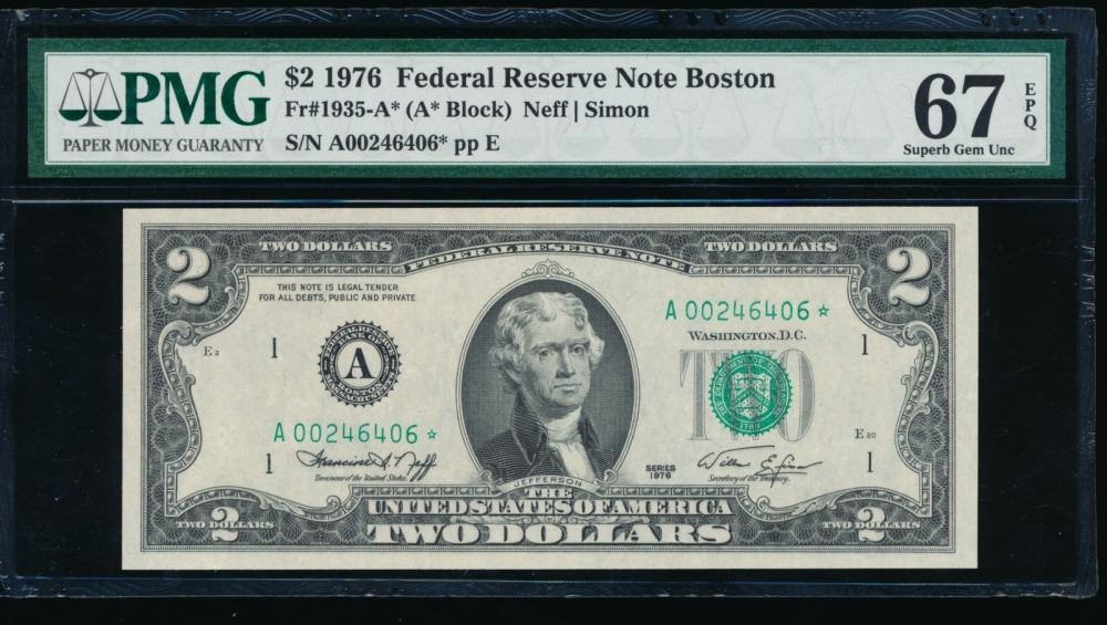 One 1976 $2 STAR Boston FRN PMG 67EPQ.