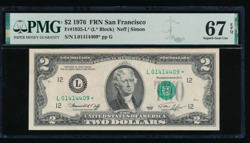 One 1976 $2 San Francisco Federal Reserve STAR Note PMG 67EPQ.
