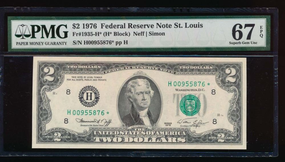 One 1976 $2 St Louis Federal Reserve STAR Note PMG 67EPQ.