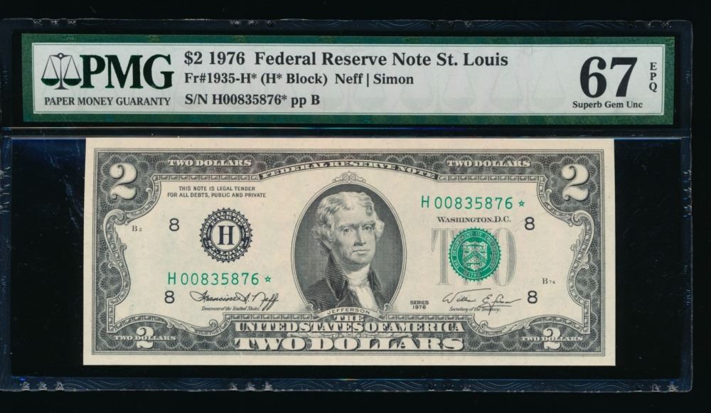 One 1976 $2 St Louis Federal Reserve STAR Note PMG 67EPQ.