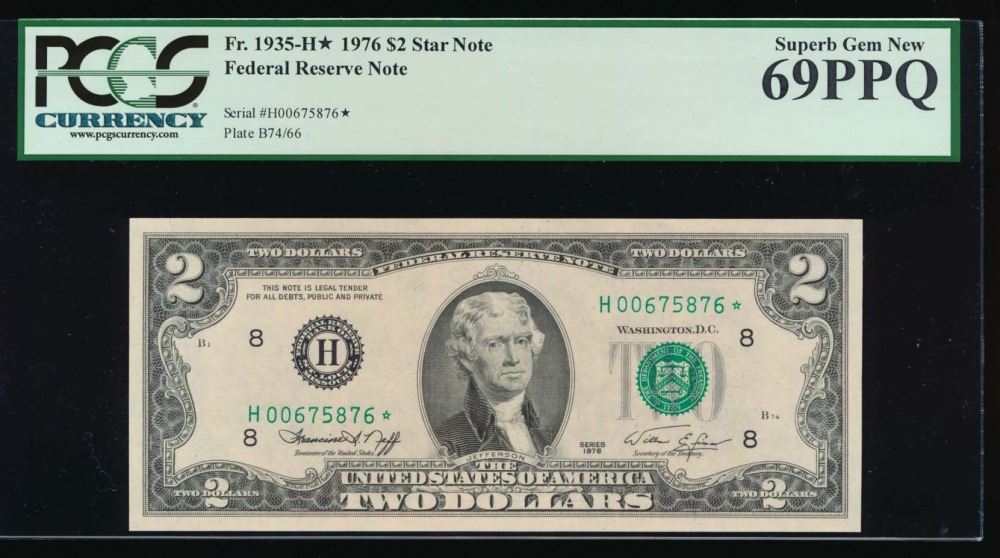 One 1976 $2 St Louis Federal Reserve Star Note PCGS 69PPQ.