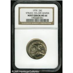 <B>1976 25C Clad Bicentennial Quarter--Struck 15% Off Center--MS66 NGC.</B></I> Struck off center toward 5 o'clock, relative to the 'drummer boy' side. Much of LIBERTY and the denomination are off the flan. Lustrous and lovely with a hint of peripheral gold color. A popular off center type. Lot:11001