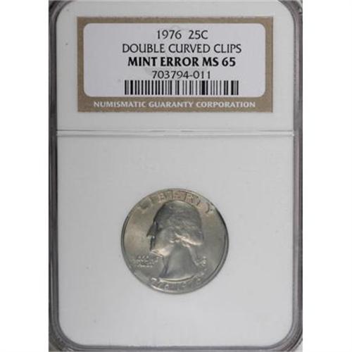 <B>1976 25C Washington Quarter Clad--Double Curved Clips--MS65 NGC.</B></I> NGC Census: (42/163). PCGS Population (101/311). Mintage: 809,784,000. Numismedia Wsl. Price for NGC/PCGS coin in MS65: $11. (#5896)<BR><BR><B>Coin Engraver:</B> John Flanagan<BR><BR><b>Shipping:</b> Coins & Currency (<a target="_blank" href="http://www.heritageauctions.com/common/shipping.php">view shipping information</a>)