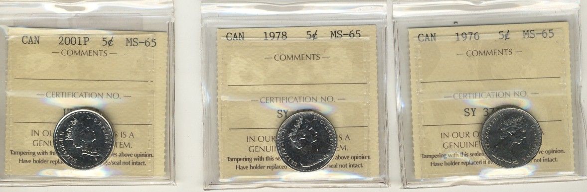 1976 5¢, 1978 & 2001P ICCS MS65. Lot of 3 coins.