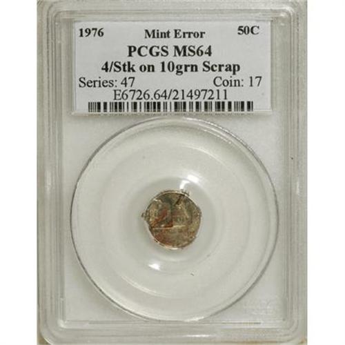 <B>1976-? 50C Bicentennial Half--Struck Four Times on 10 gn Scrap--MS64 PCGS.</B></I> The partial legend "NDENCE HA" helps identify the type, which was struck only in 1975 and 1976. Multiple sets of the leftmost letters in E PLURIBUS UNUM determine the number of strikes. The obverse shows portions of Kennedy's hair. Lustrous with slate-gray and copper-red surfaces.<BR><BR><B>Coin Engraver:</B> Gilroy Roberts and Frank Gasparro<BR><BR><b>Shipping:</b> Coins & Currency (<a target="_blank" href="http://www.heritageauctions.com/common/shipping.php">view shipping information</a>)
