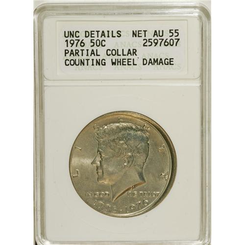 <B>1976 50C Half Dollar--Partial Collar, Counting Wheel Damage--Unc Details, Net AU55 ANACS.</B></I> NGC Census: (1/154). PCGS Population (4/354). Mintage: 234,308,000. Numismedia Wsl. Price for NGC/PCGS coin in AU55: $0.50. (#6726)<BR><BR><b>Shipping:</b> Coins & Currency (<a target="_blank" href="http://www.heritageauctions.com/common/shipping.php">view shipping information</a>)