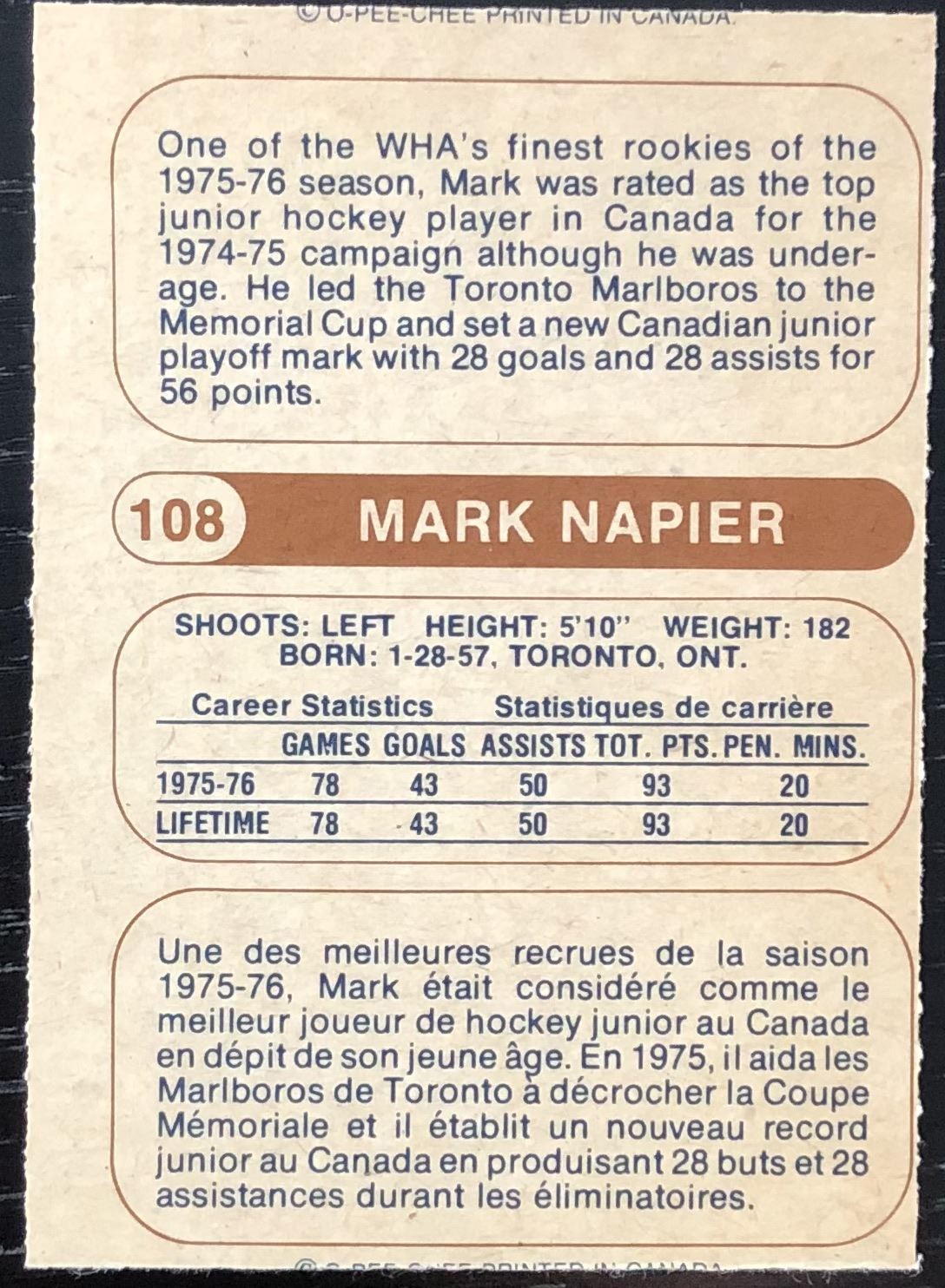 Card #108 WHA, hockey, vintage, OPC, rookie