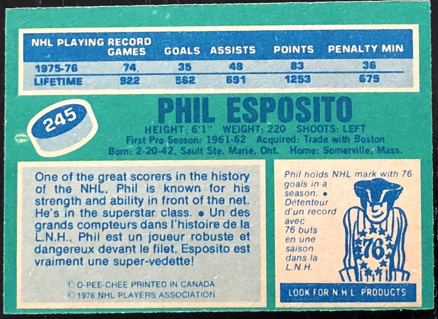 Card #245 NHL, hockey, vintage, OPC, hall of fame