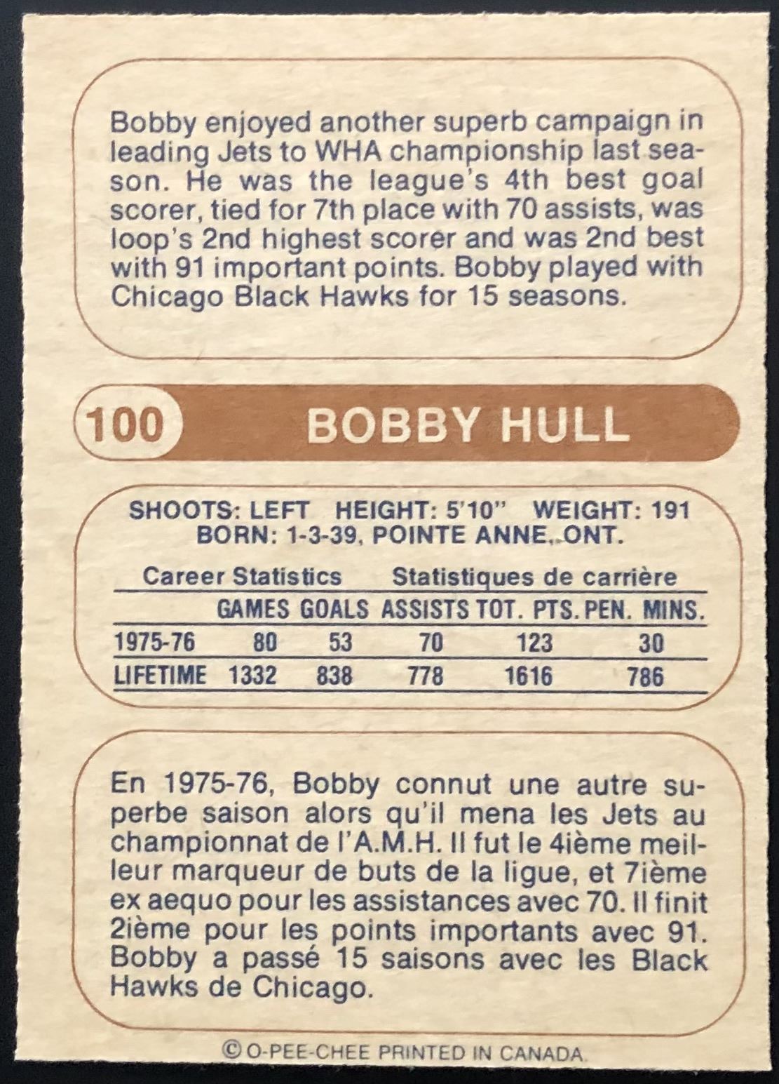 Card #100                   WHA, hockey, vintage, OPC, HALL OF FAME