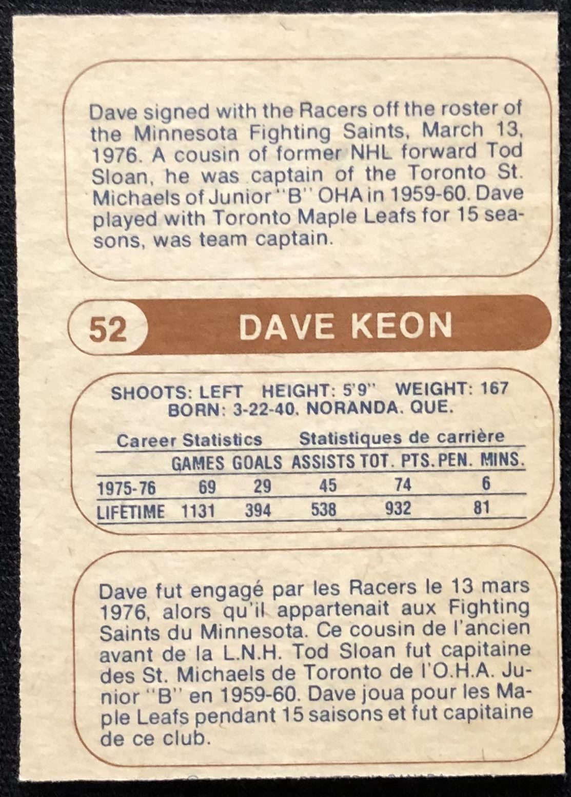 Card #52 WHA, hockey, OPC, vintage, hall of fame