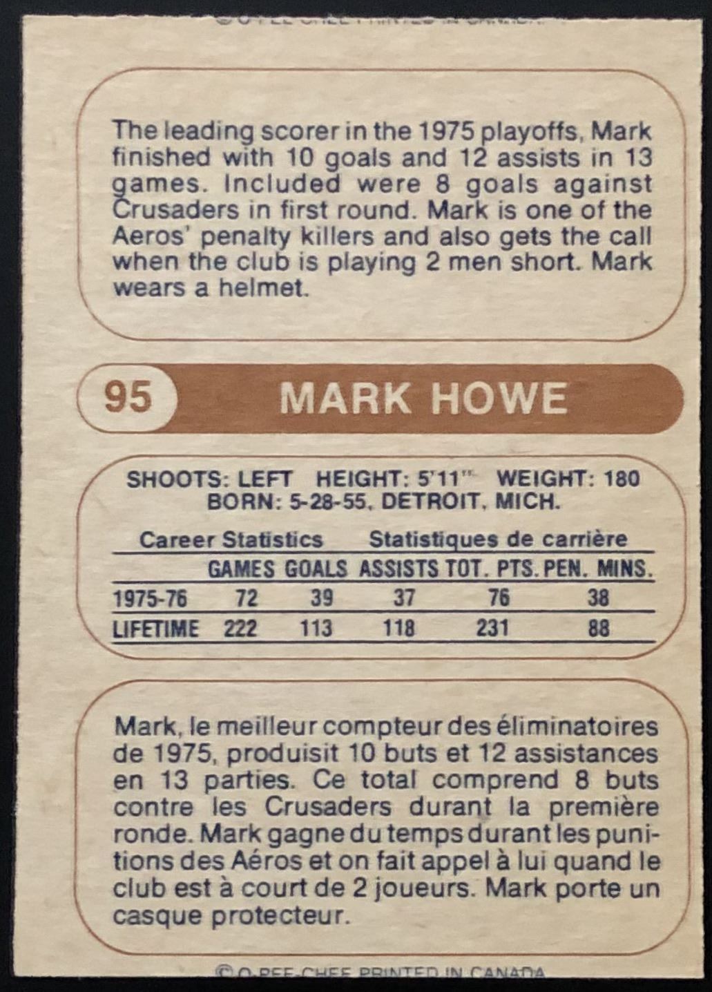 Card #95 hockey, WHA vintage, OPC, hall of fame