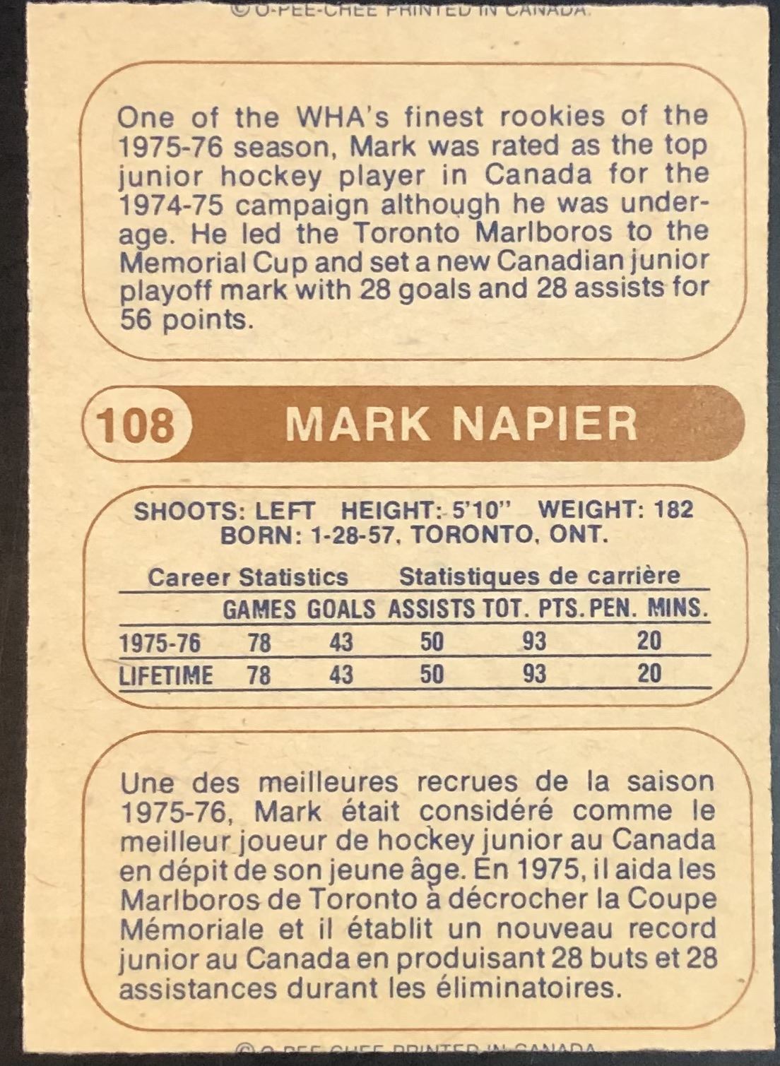 Card #108 WHA, hockey, rookie, vintage