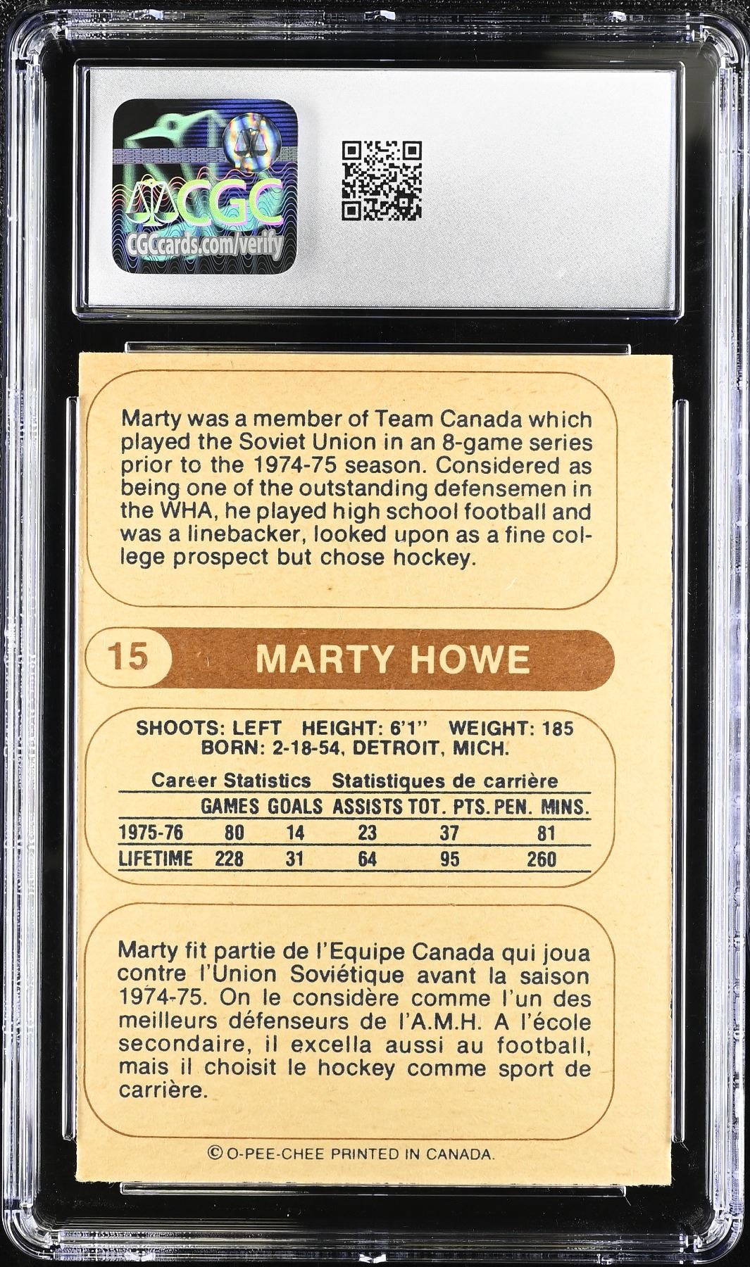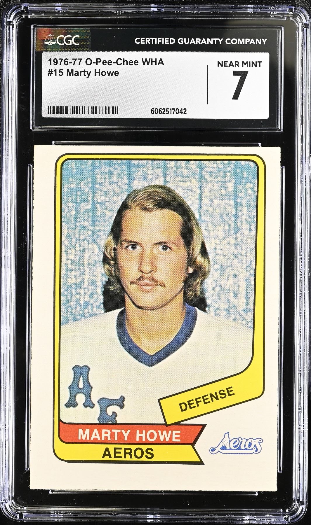 When Gordie Howe jumped to the WHA it wasn't all about the money, but rather the unique opportunity to play with his sons. Marty was a solid defenseman who put up some good numbers in the WHA and won back-to-back Avco Cups. He played a few years in the NHL as well. Graded 7 NM by CGC.