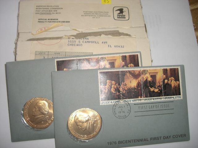 1976 AMERICAN REVOLUTION BICENTENNIAL COMMISSION POST OFFICE SAN FRANCISCO FIRST DAY COVER WITH COIN AND STAMPS IN ORIGINAL MAILING PACKAGE!! PACKAGE HAS 2 SETS OF THEM!! ITEM CAME OUT OF SAFE!! ***Coin, Currency & All Items Listed in this auction - Grades, Conditions and Values are not Safe Deposit Coins LLC Responsibilty. Grades, Condition and Values are determined by Consigner(s) & Buyers ONLY