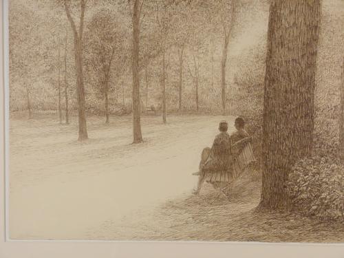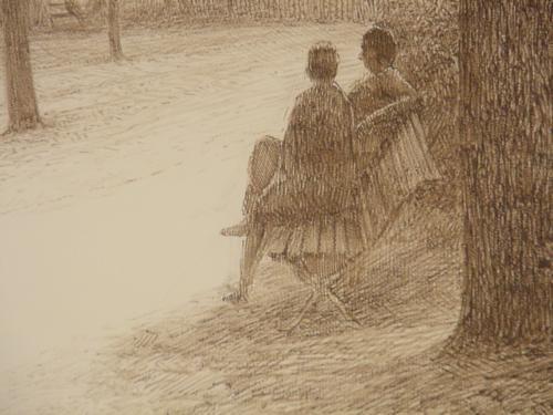 Offered here is an original Conte pencil drawing by well-known American artist, Harold Altman: Title: "Seated Couple" 1976 Conte pencil on paper Signed by the artist in pencil LL Drawing: 22 × 30 Framed size: 32 × 39½ Drawing appears to be in excellent condition; has not been examined outside of the frame Twisted dark wood frame shows slight signs of age and use; readily touched up Certificate of Authenticity Authenticity unconditionally guaranteed Harold Altman (American, 1924 - 2003) attended the Art Students League, the Black Mountain College, the Academie de la Grande Chaumiere in Paris, and is a graduate of the Cooper Union Art School. Altman's work has been exhibited at many international museums and galleries and is represented in nearly every significant collection in the world, including the Museum of Modern Art and the Whitney of New York, the Brooklyn Museum, the Victoria and Albert Museum of London, the Stedelijk Museum of Amsterdam, the Kunst Museum of Basel, the Royal Museum of Fine Arts of Copenhagen and the Bibliotheque Nationale of Paris. The artist has been the recipient of two Guggenheim Fellowships, a Tamarind Lithography Fellowship, a National Institute of the Arts and Letters Award, a Fulbright-Hayes Senior Research Fellowship for work in France and a National Endowment for the Arts Grant. * * A very representative and masterful Altman original - an important acquisition for the discerning collector.