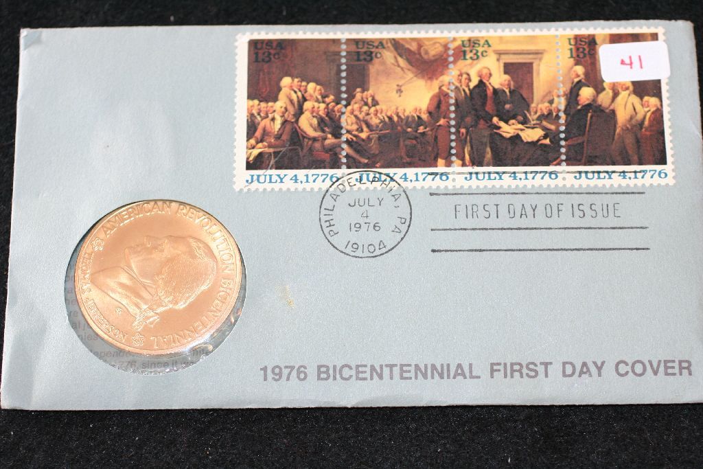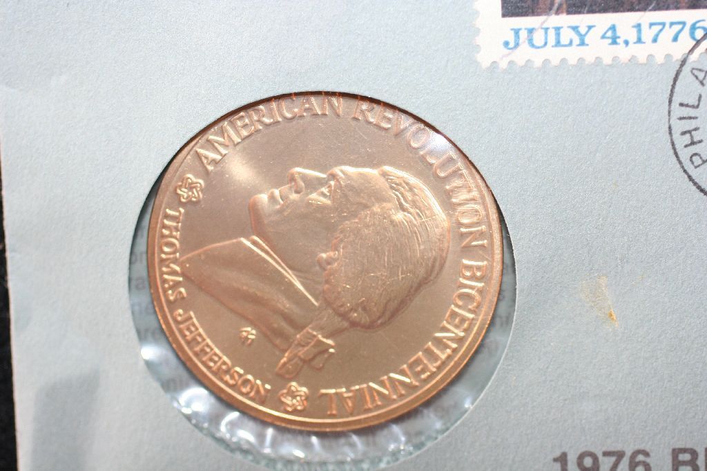 1976 American Revolution Bicentennial First Day Cover Thomas Jefferson Commerative Medallion W/Postal Stamps