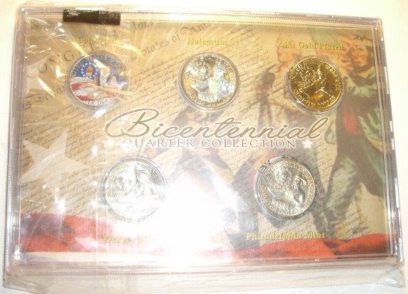 1976 BICENTENNIAL QUARTER SET COLORIZED/HOLOGRAM/24KTGP/D-MINT/P-MINT 5 TOTAL *COMES IN ORIGINAL DISPLAY CASE*!! SET CAME OUT OF SAFE DEPOSIT BOX!! ***Coin, Currency & All Items Listed in this auction - Grades, Conditions and Values are not Safe Deposit Coins LLC Responsibilty. Grades, Condition and Values are determined by Consigner(s) & Buyers ONLY