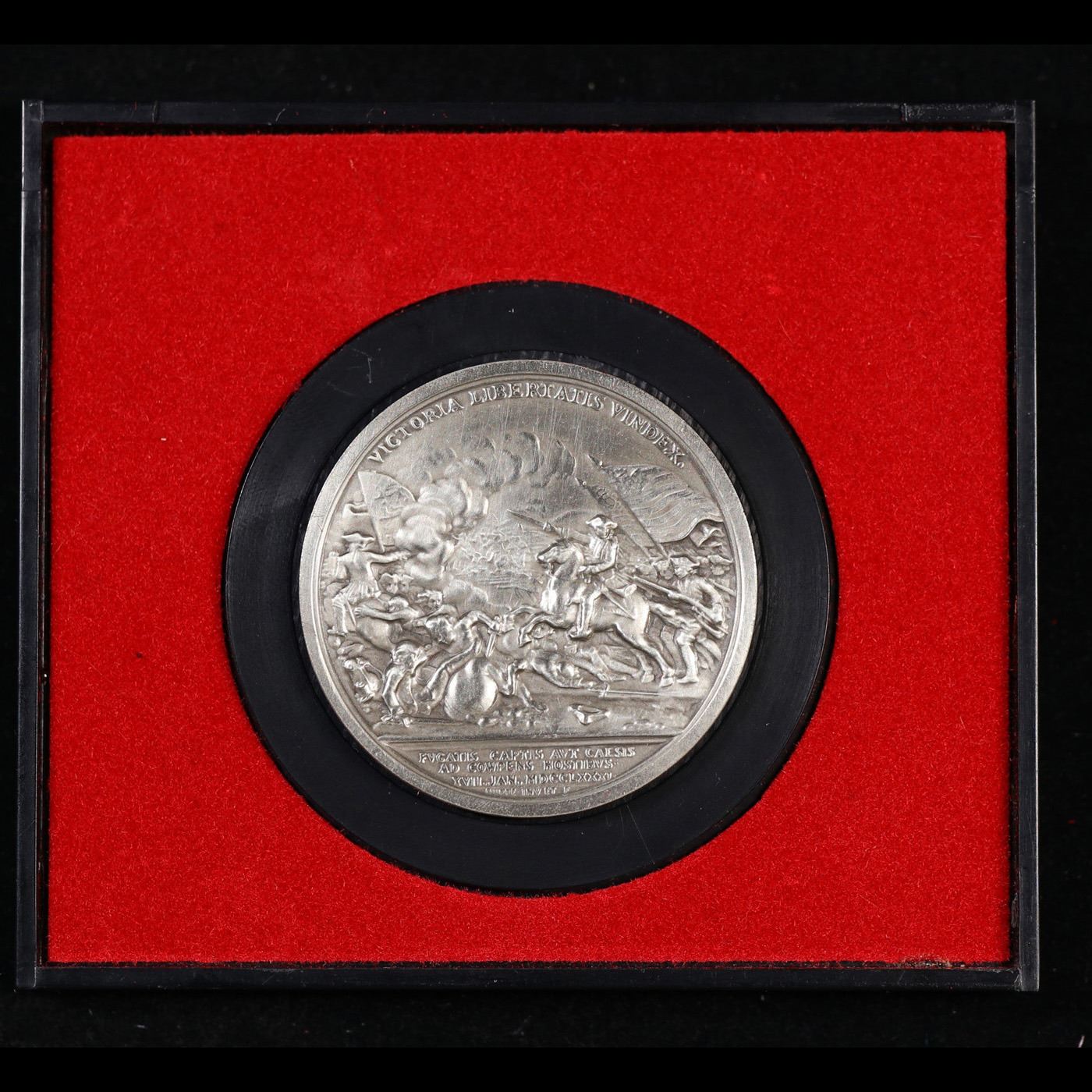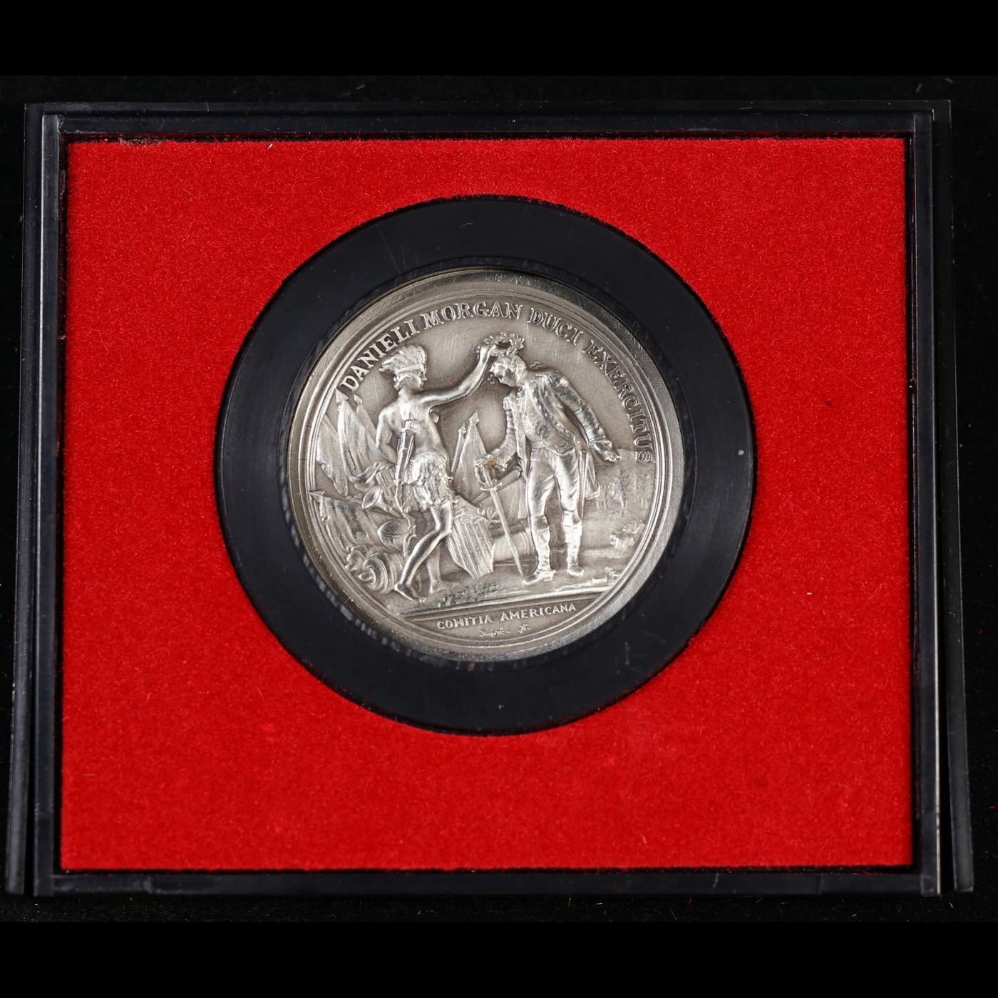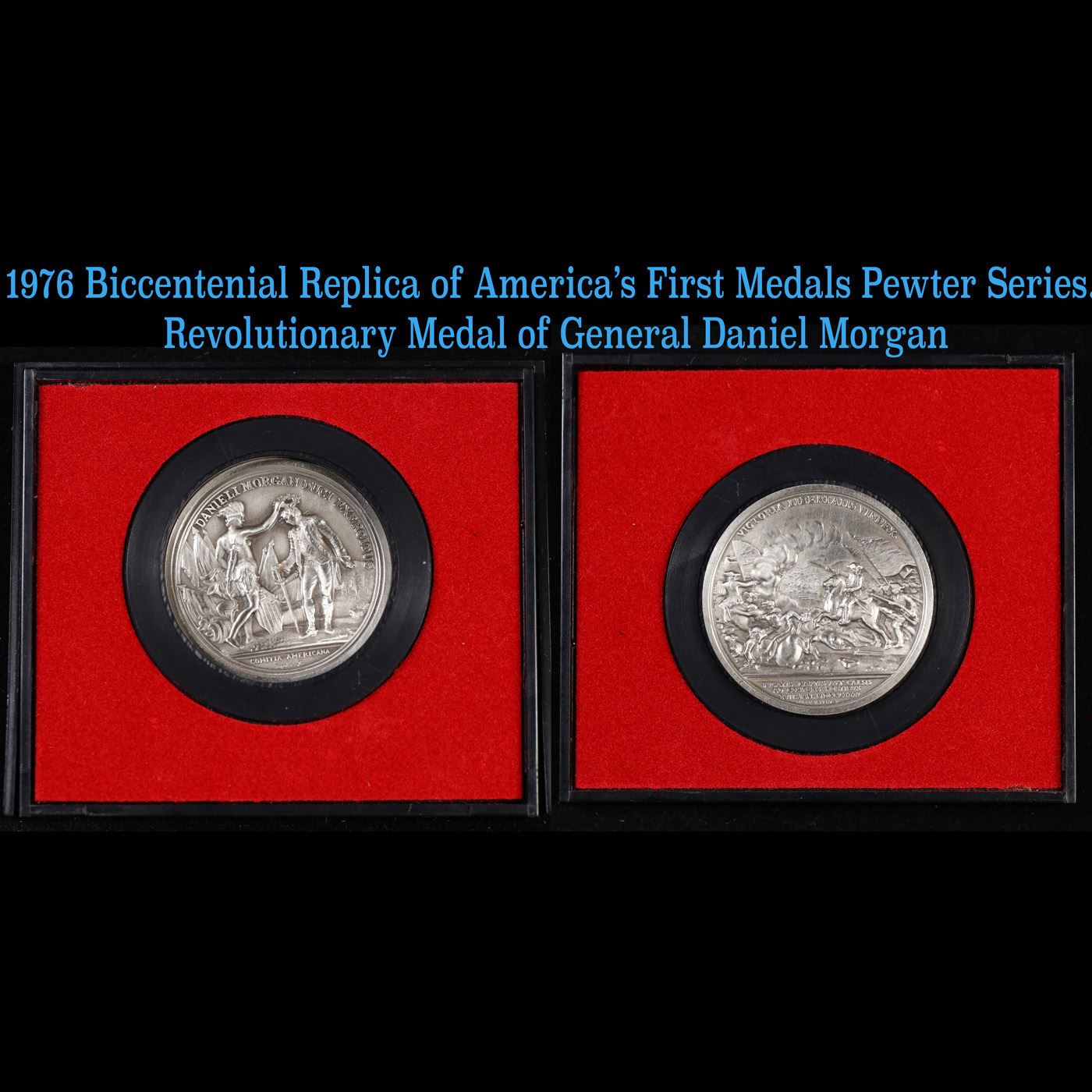 1976 Biccentenial Replica of America’s First Medals Pewter Series. Revolutionary Medal of General Daniel Morgan. The Sixth Medal of the Ten-piece series.. The ten-medal series, part of the Treasury Department’s Bicentennial program, consists of 1-1/2? pewter reissues of the first medals voted by the Continental Congress to honor the bold commanders and successful Revolutionary War battles that won for a new nation its freedom and independence. After the outbreak of the American Revolution, Morgan led a force of riflemen to reinforce the patriots laying siege to Boston in 1775. His company, known as “Morgan's riflemen” marched from Virginia to Boston in 21 days.