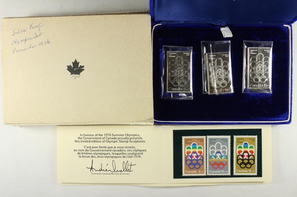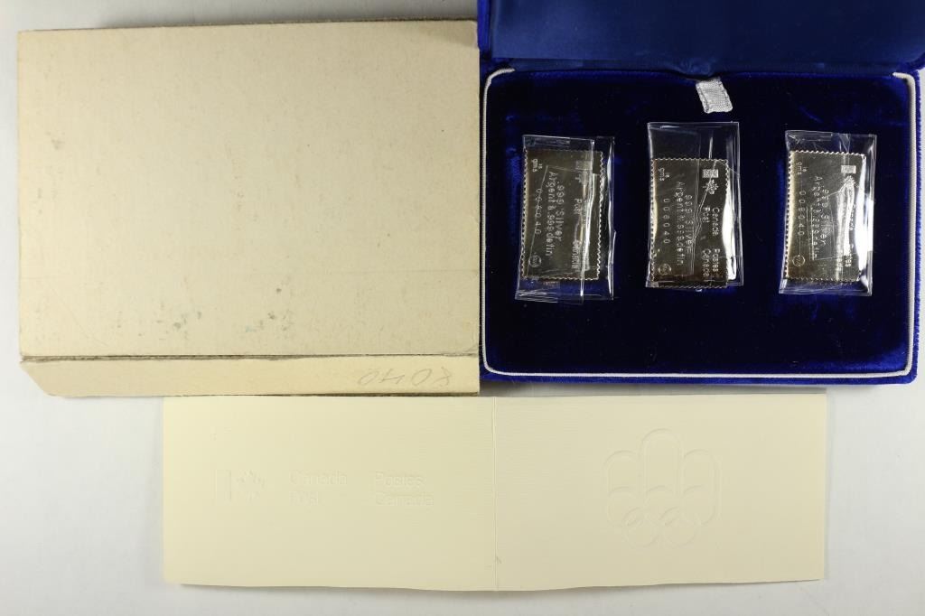 INGOTS DEPICTING OLYMPIC STAMPS. INCLUDES THE 3 MINT UNUSED OLYMPIC STAMPS, ALSO, ORIGINAL ROYAL CANADIAN MINT PACKAGING