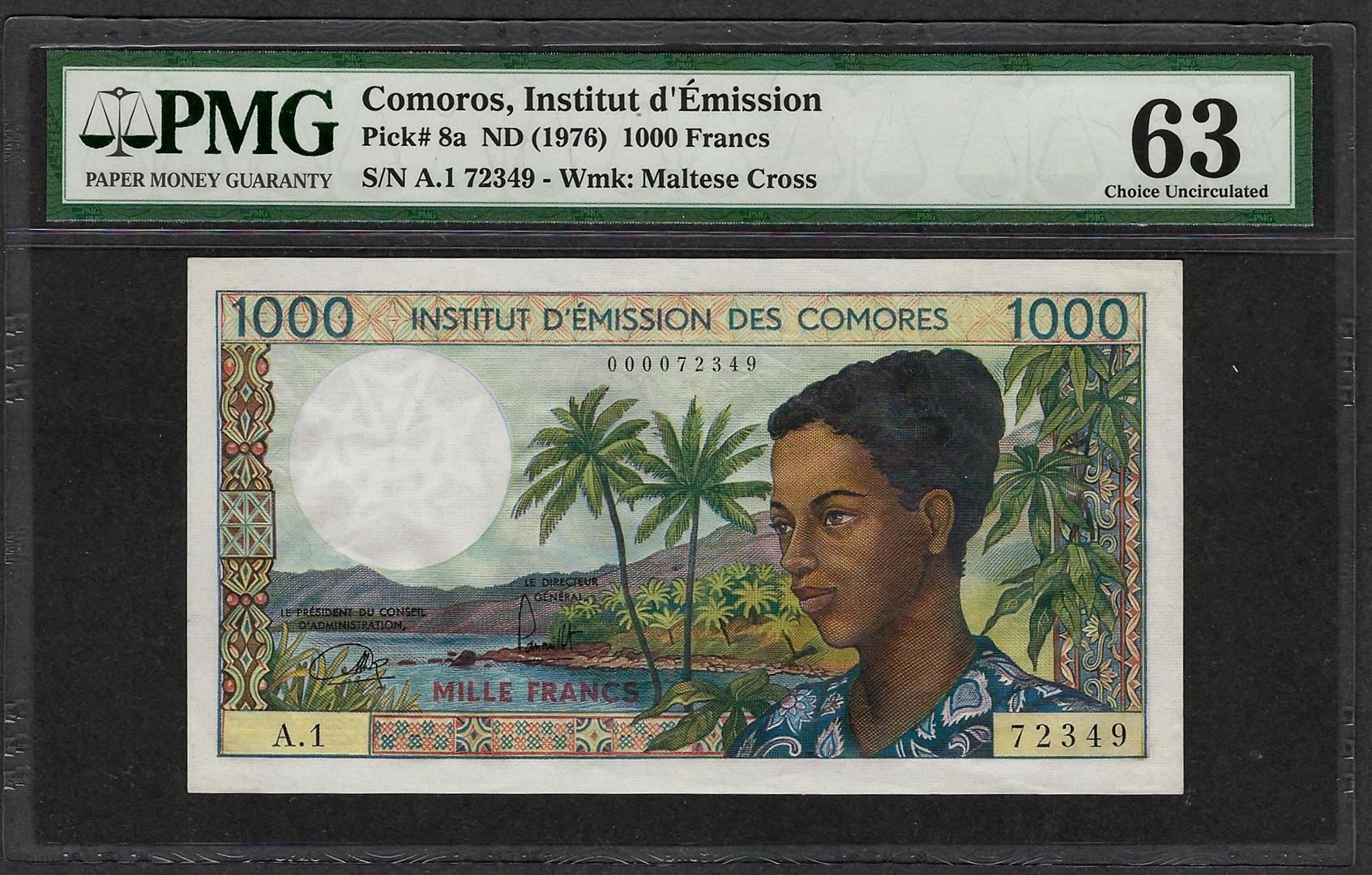One 1976 Comoros Institut d'Emission 1000 Francs Currency Note PMG Choice Uncirculated 63. PMG Certified.