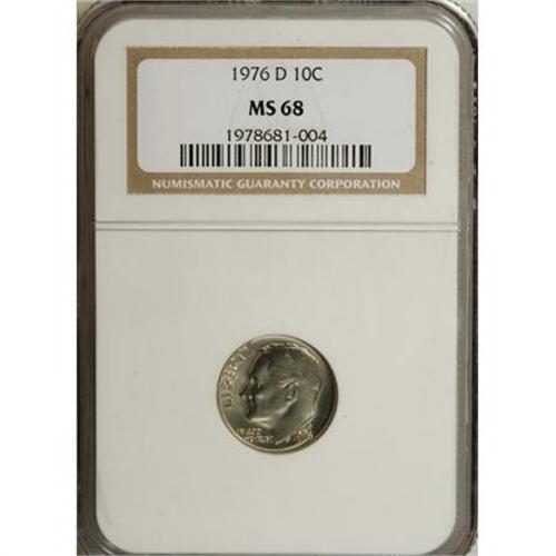 <B>1976-D 10C MS68 NGC.</B></I> NGC Census: (1/0). PCGS Population (3/0). Mintage: 695,222,784. (#5150)<BR><BR><B>Coin Engraver:</B> John R. Sinnock<BR><BR><b>Shipping:</b> Coins & Currency (<a target="_blank" href="http://www.heritageauctions.com/common/shipping.php">view shipping information</a>)