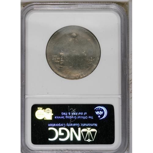 <B>1976-D<50C> Clad Bicentennial Kennedy Half--Die Adjustment Strike--NGC.</B></I> NGC does not designate a grade for this piece. No wear is evident, but the weakly struck surfaces are glossy, perhaps from a past wipe. We suggest a net grade of AU50. Toned in pastel peach and powder-blue shades. Portions of the Independence Hall confirm the Bicentennial type, and the Denver mintmark is faintly apparent near the bust tip.