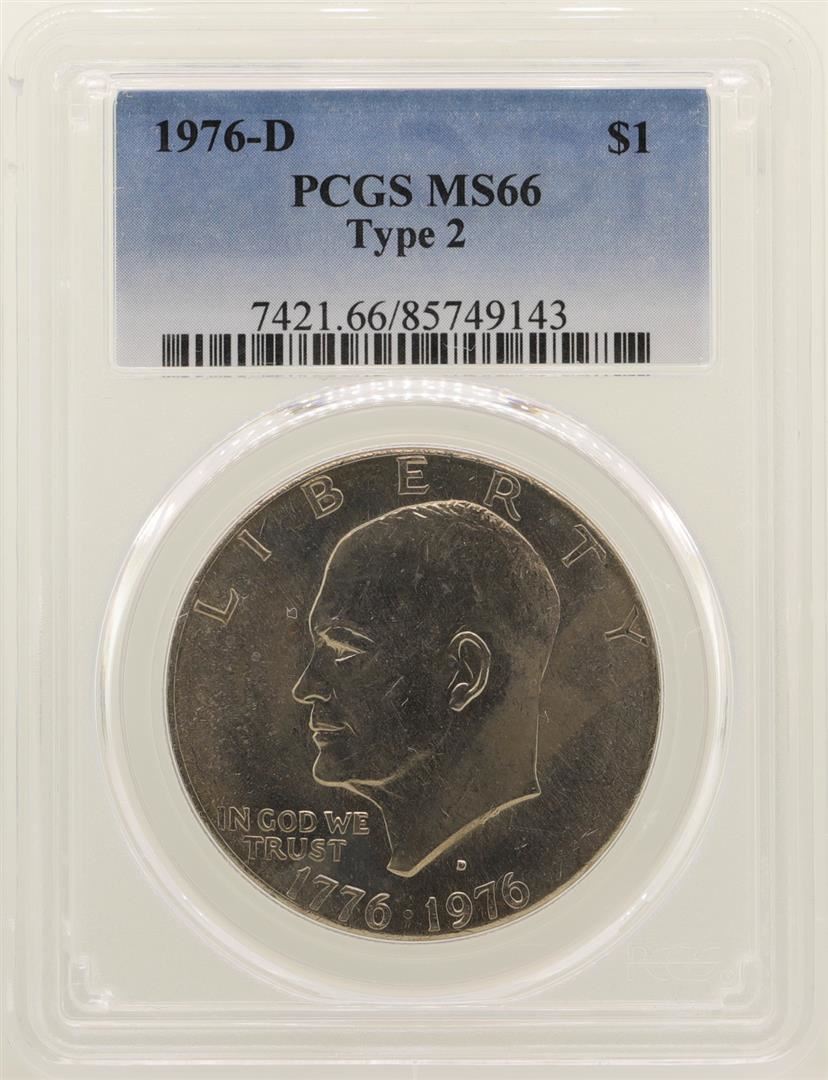 One 1976-D Eisenhower Dollar PCGS MS66 Type 2. PCGS Graded.