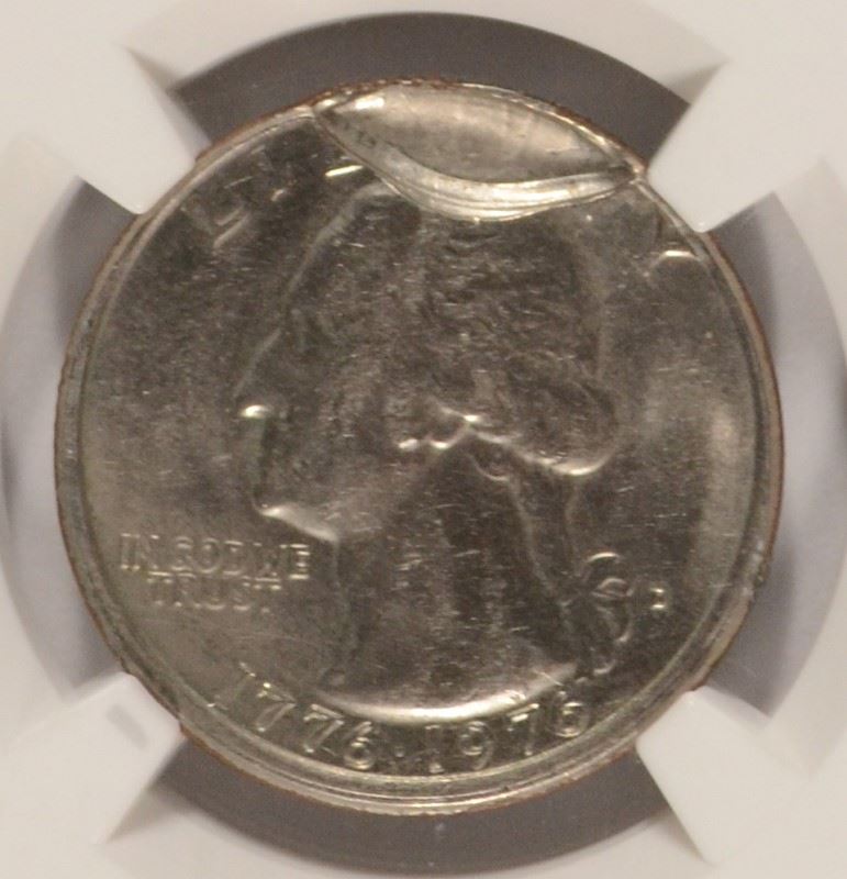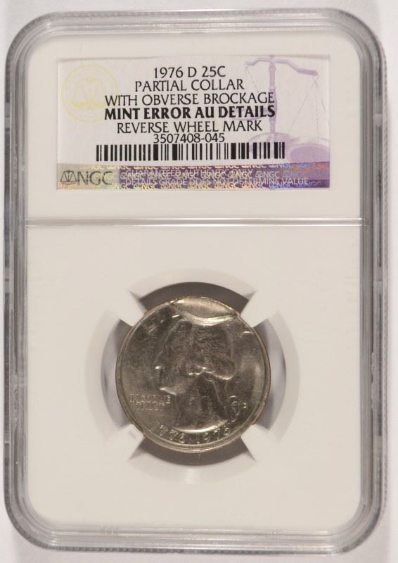 1976-D WASHINGTON QUARTER, NGC MINT ERROR, PARTIAL COLLAR, AU DETAILS!