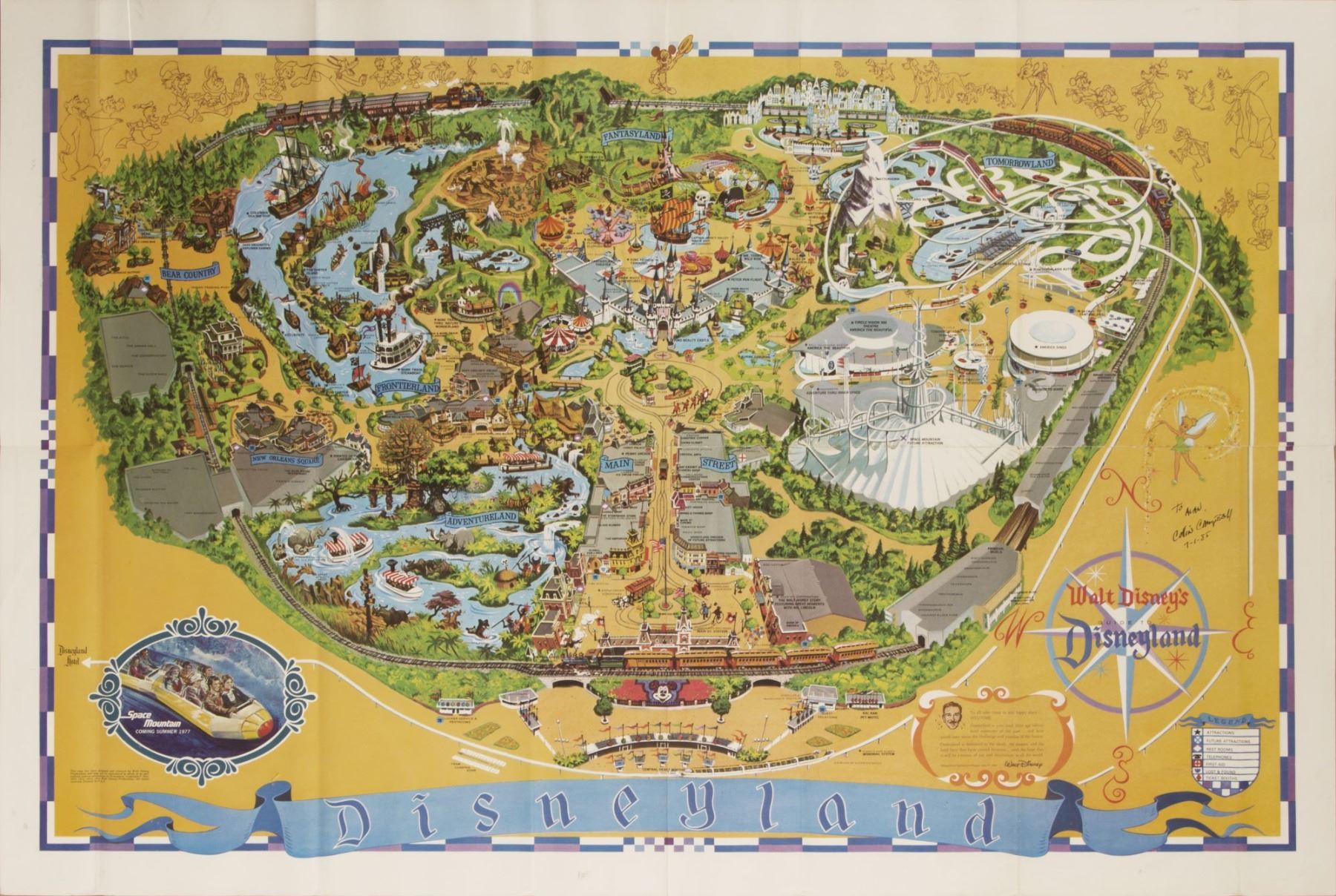 (Disneyland, 1976) A large souvenir map of Disneyland from 1976 signed by Imagineer Collin Campbell. This map features an advertisement in the lower-left corner promoting the opening of Space Mountain in summer of 1977, and Campbell signed the map "to Alan" on the right side. Measuring 30"x44.5â€, the condition is very good with some wear to the fold-lines and minor edge-wear.