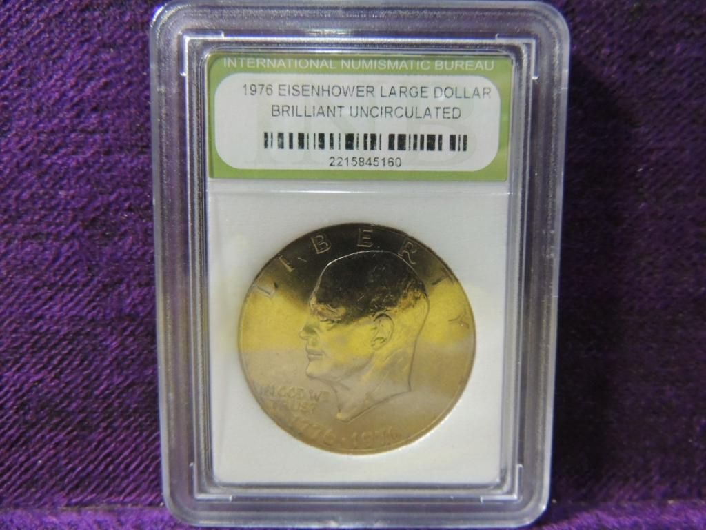 1976 EISENHOWER LARGE DOLLAR BRILLIANT UNCIRCULATED GRADED COIN. CERTIFIED COINS. INTERNATIONAL NUMISMATIC BUREAU SEALED GRADED COIN. GOOD CONDITION. GENUINE COIN. US CURRENCY. COIN COLLECTIBLE. MONEY COLLECTIBLE. PROTECTIVE CASE. AS SHOWN. SEE PHOTO FOR