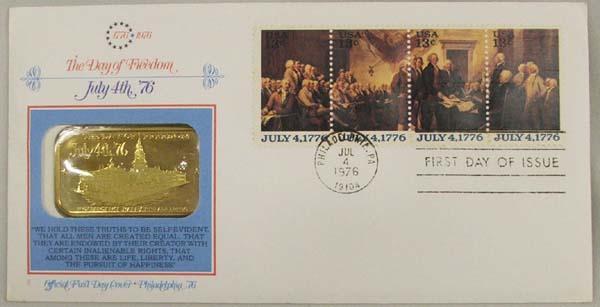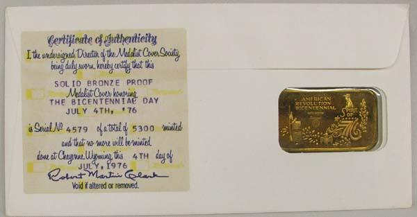 1976 First Day Cover & Bronze Proof Stamp Set. Measures approx. 1 3/4'' x 1 1/4'', envelope measures approx. 4 1/2''H x 7 1/2''L. Buyers Pay Actual Shipping and Handling Charges(see terms and conditions for more information).