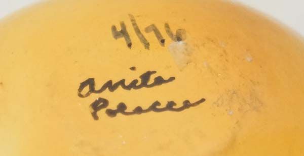 April 1976 Hopi Polychrome Pottery Jar by Anita Polacca, measures 4.5''H x 5.5''D, signed and dated on bottom of jar by artist