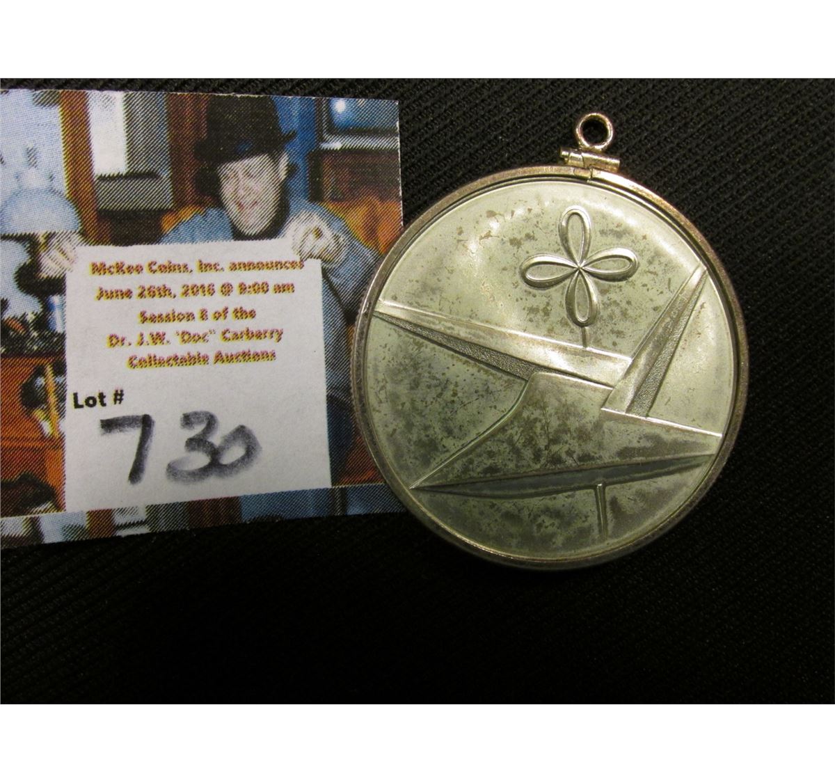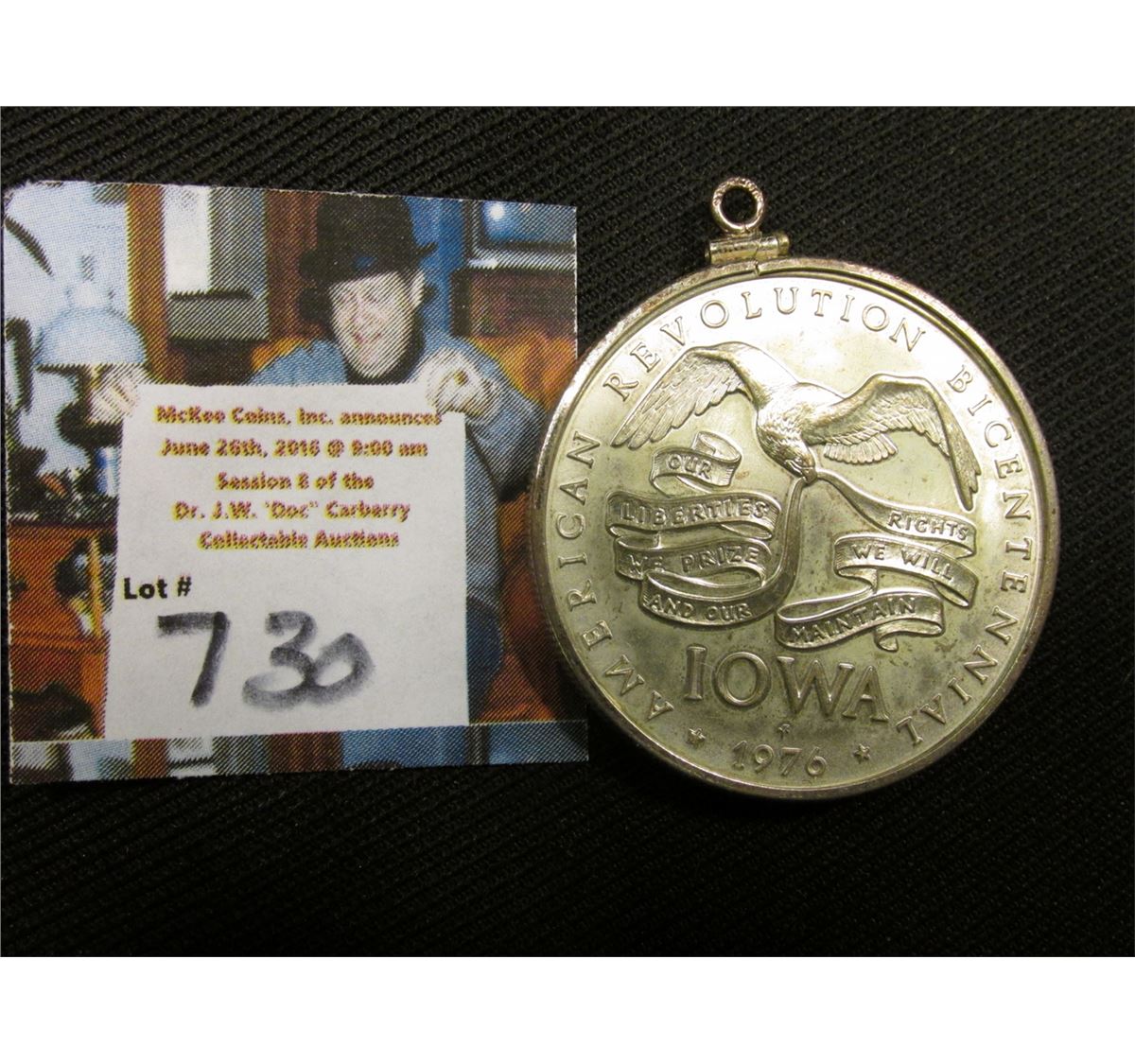 1976 Iowa American Revolution Bicentennial Sterling Silver Medallion, depicts State Seal and stylized plow, in a Sterling Silver bezel. AU. Catalog value $75.00.