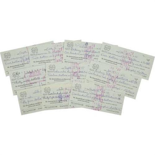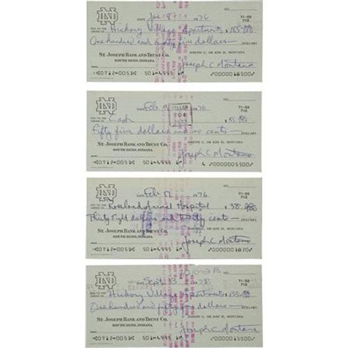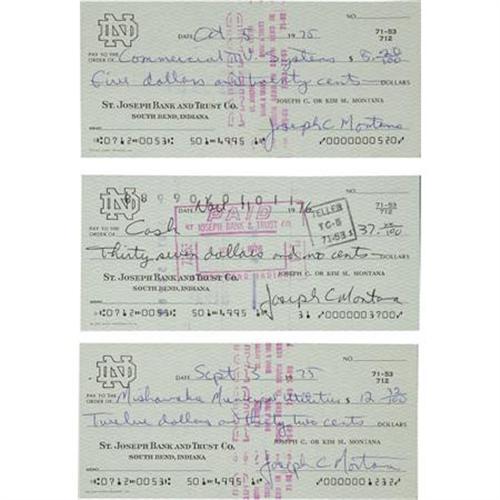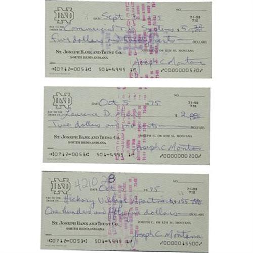 <B>1975-76 Joe Montana Signed Checks Lot of 10.</B></I> Ten checks drawn on Joe and Kim Montana's Notre Dame bank account make payments to his apartment complex, utilities and an animal hospital. Each is filled out entirely in the superstar quarterback's hand, and signed "Joseph C. Montana" at the close. All are in flawless condition, with no folds, tears or other condition problems. One of several lots of checks offered within this auction. We are aware of no other Montana checks ever having surfaced in the hobby prior to this grouping. <I>LOA from PSA/DNA. LOA from James Spence Authentication.</B></I><BR><BR><b>Shipping:</b> Miscellaneous Collectibles, Smal (<a target="_blank" href="http://www.heritageauctions.com/common/shipping.php">view shipping information</a>)