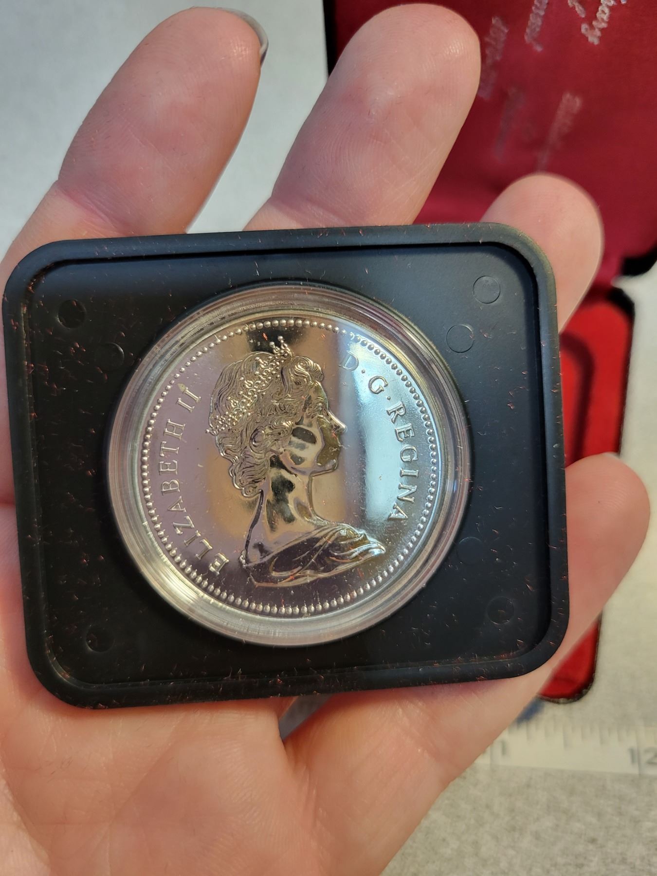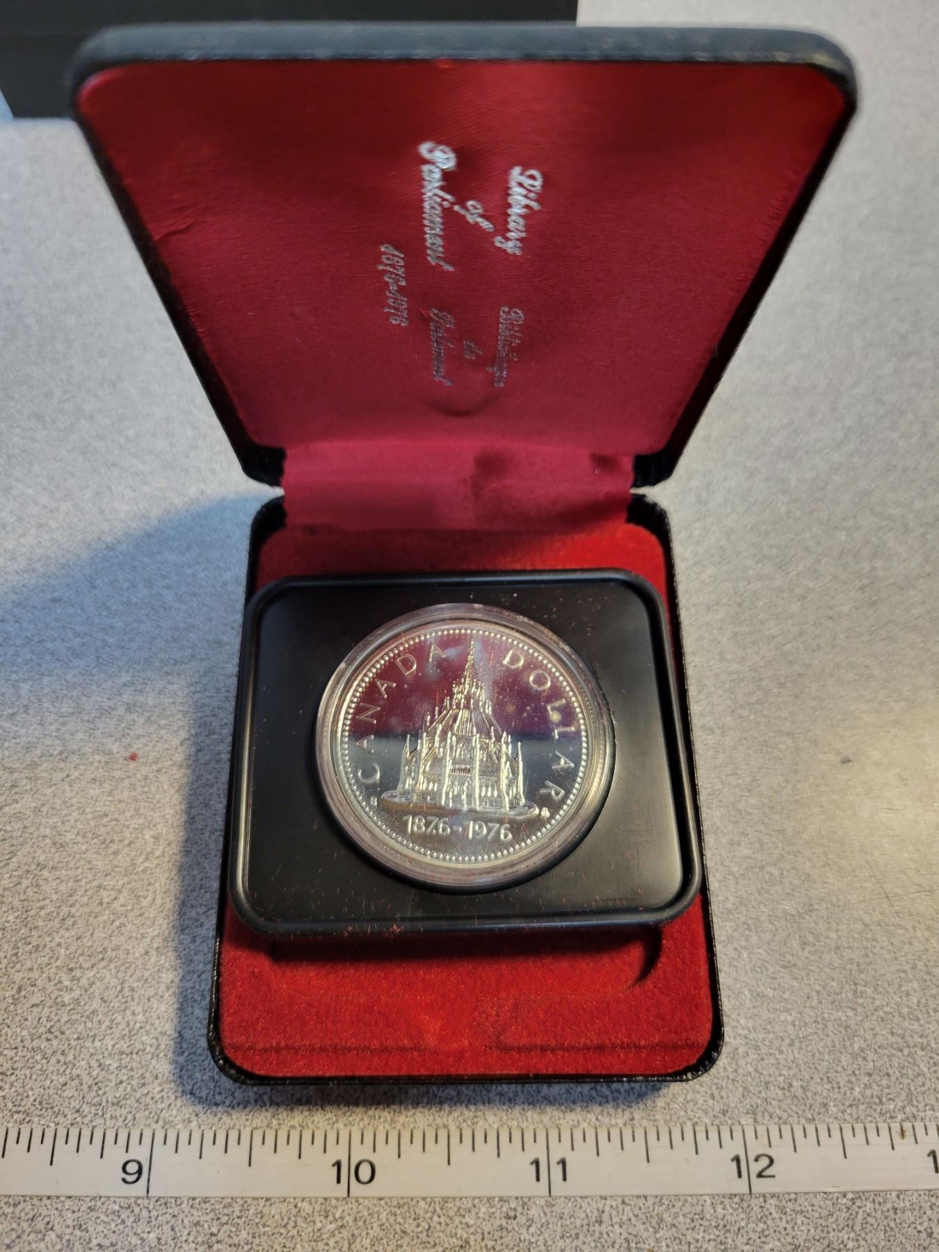 1976 Library of Parliament Silver Dollar. Specimen. Bright White. Housed in its original black clamshell case of issue.