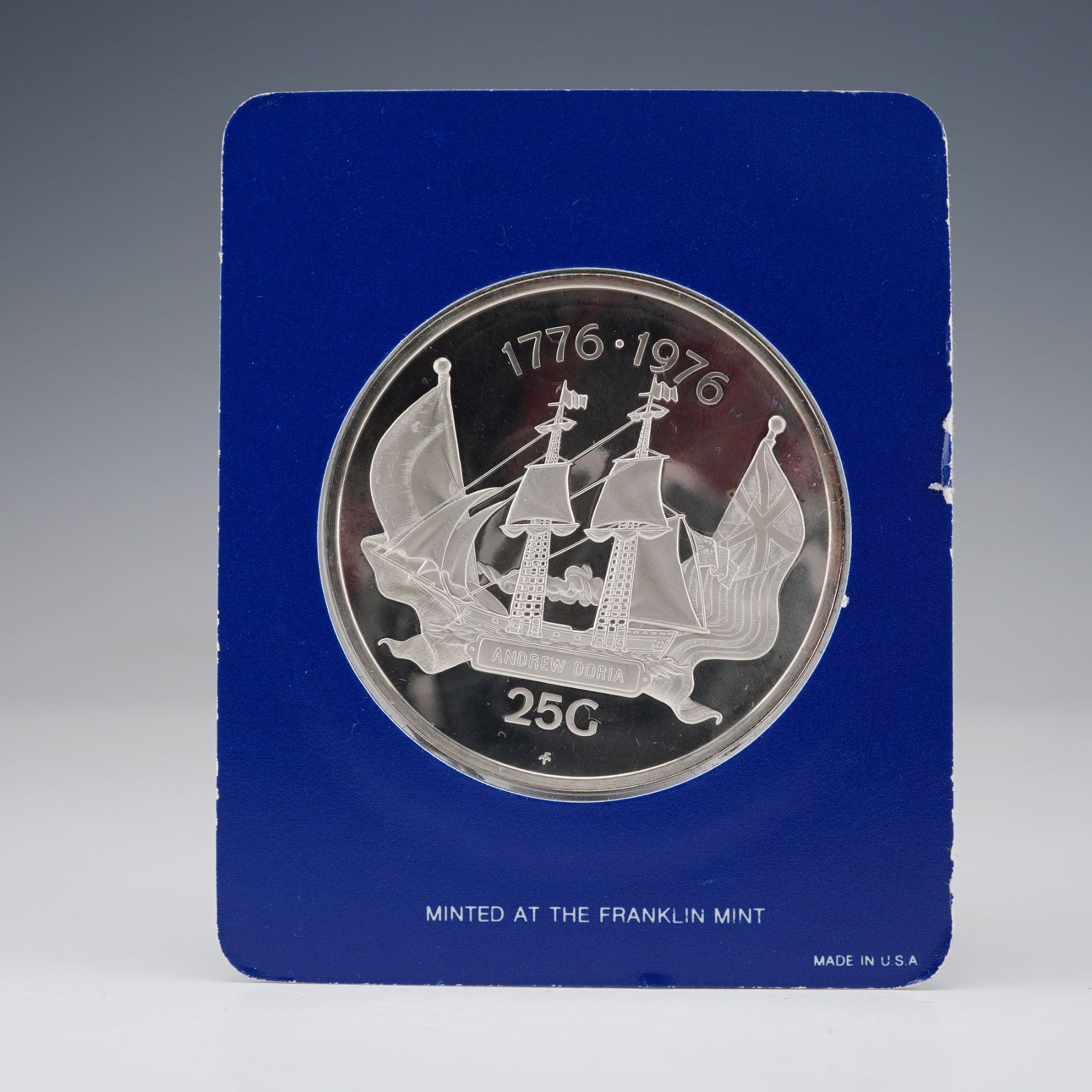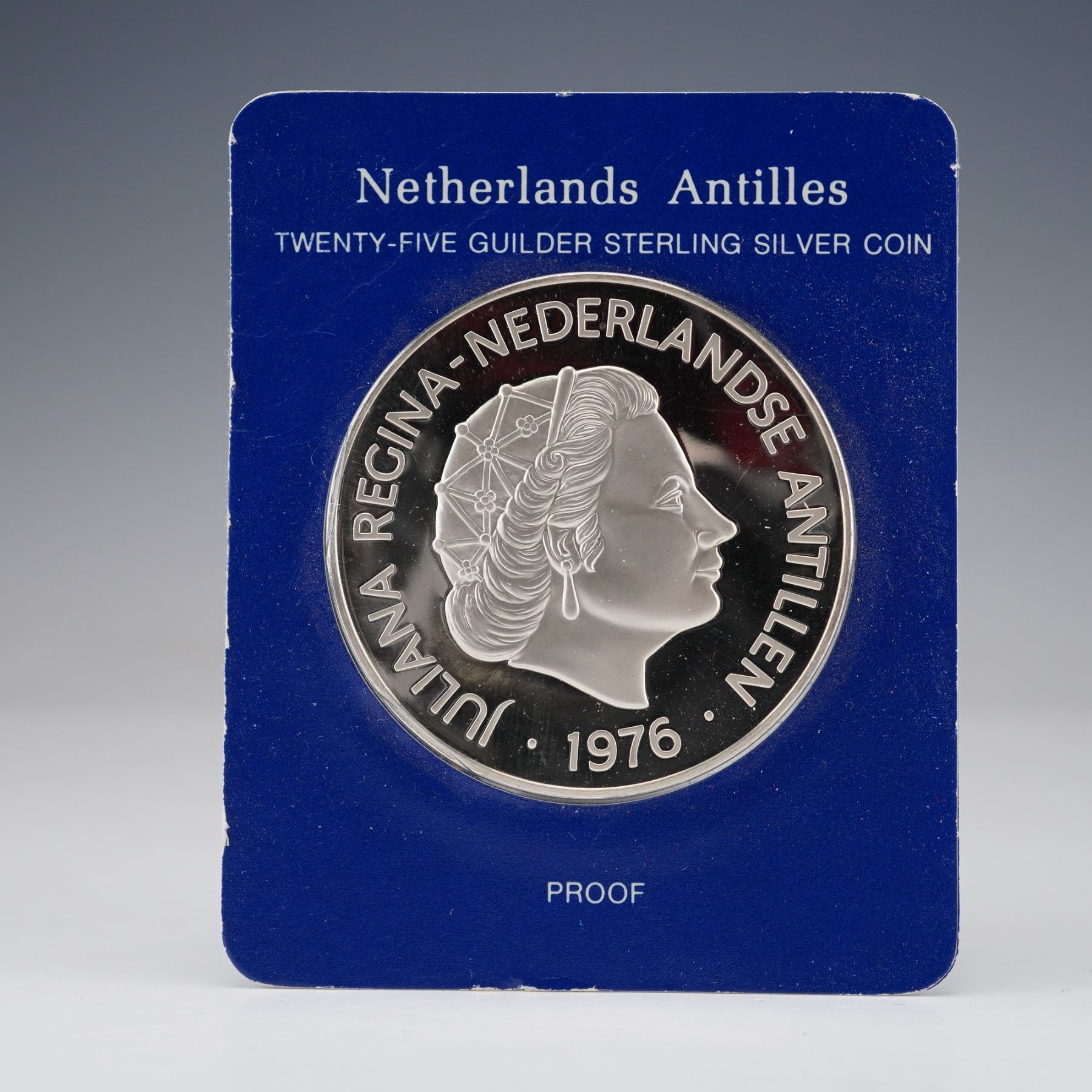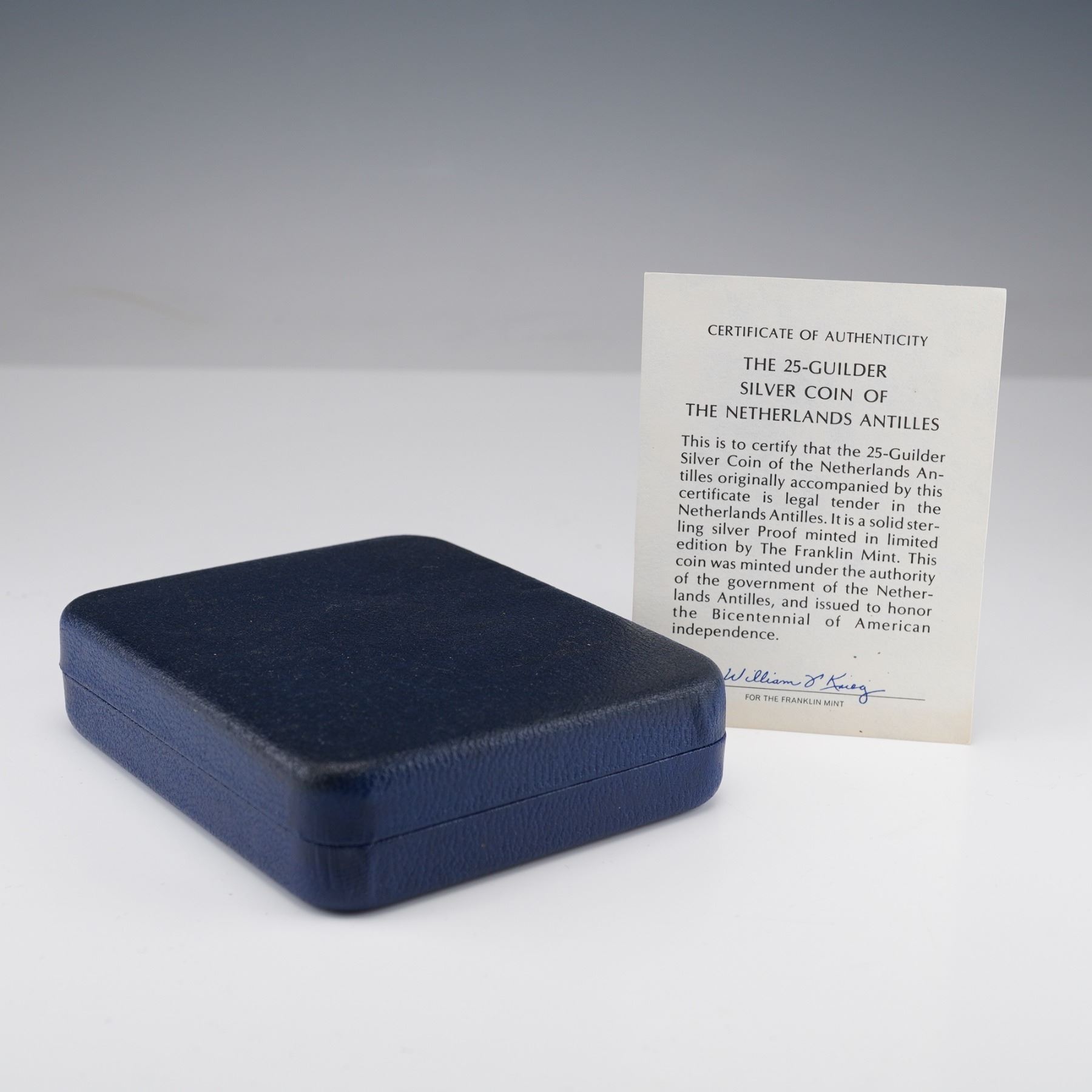 Sterling silver proof issue minted by The Franklin Mint. The obverse features a right-facing portrait of Queen Juliana encircled by the legend Juliana Regina Netherlands Antilles and dated 1976. The reverse depicts the historic Dutch vessel Andrew Doria beneath dual dates 1776-1976, commemorating the Bicentennial, along with the denomination 25G. The coin remains sealed on its original blue Franklin Mint display card, with crisp mirrored fields and frosted devices characteristic of a proof strike. Net Silver weight 1.334 troy oz.