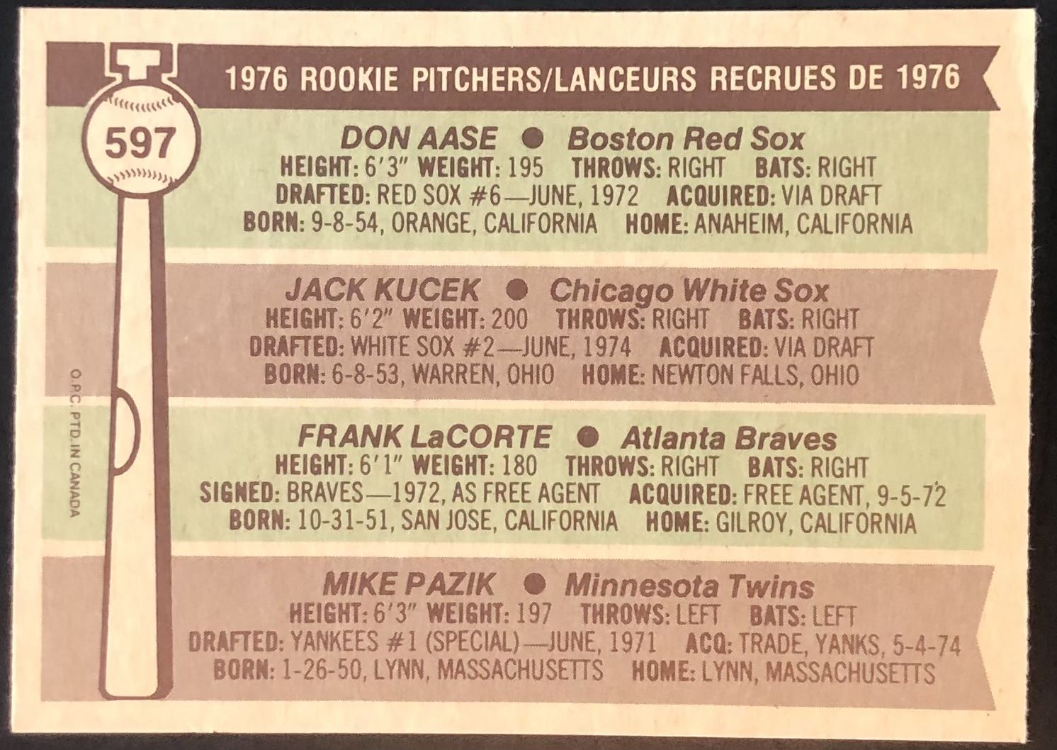 Card #597, creasing MLB, baseball, OPC, vintage, hall of fame