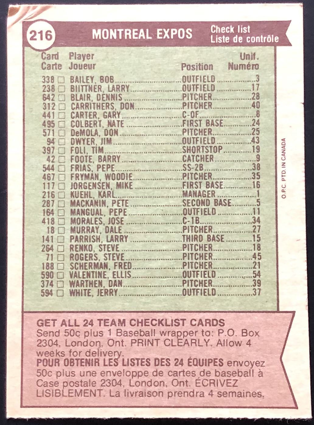 Card #216, crease bottom right corner OPC, Vintage, MLB, baseball