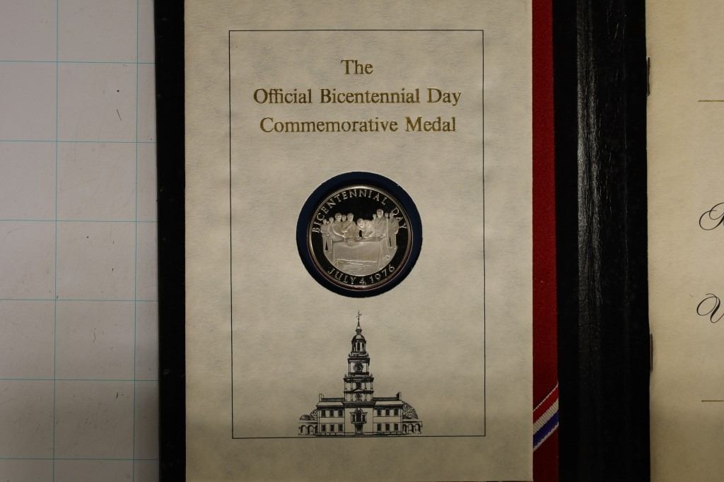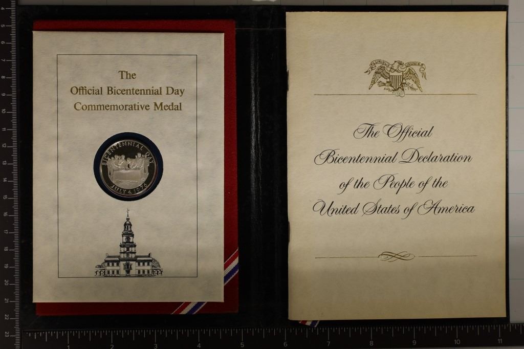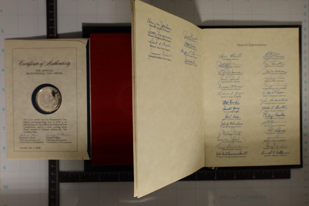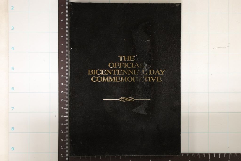 IN BLACK BOOK COINTANING A REPRODUCTION OF SIGNATURES FROM THE BICENTENNIAL DECLARATION OF THE UNITED STATES