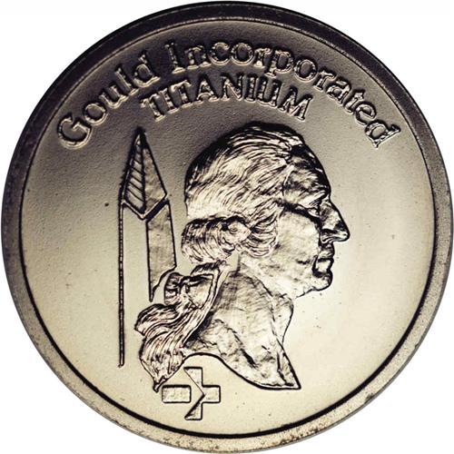 <B>Undated (ca.1977)<P$1> George Washington Dollar, Pollock-5445, R.7. MS67 NGC.</B></I> A Gould Incorporated privately minted pattern dollar. The obverse is attractively designed with a bust of Washington and the Washington Monument and above is GOULD INCORPORATED / TITANIUM. The reverse has the Great Seal of the United States. Struck in titanium with a plain edge. Brilliant throughout with exceptionally well-preserved surfaces. Envelope Included.