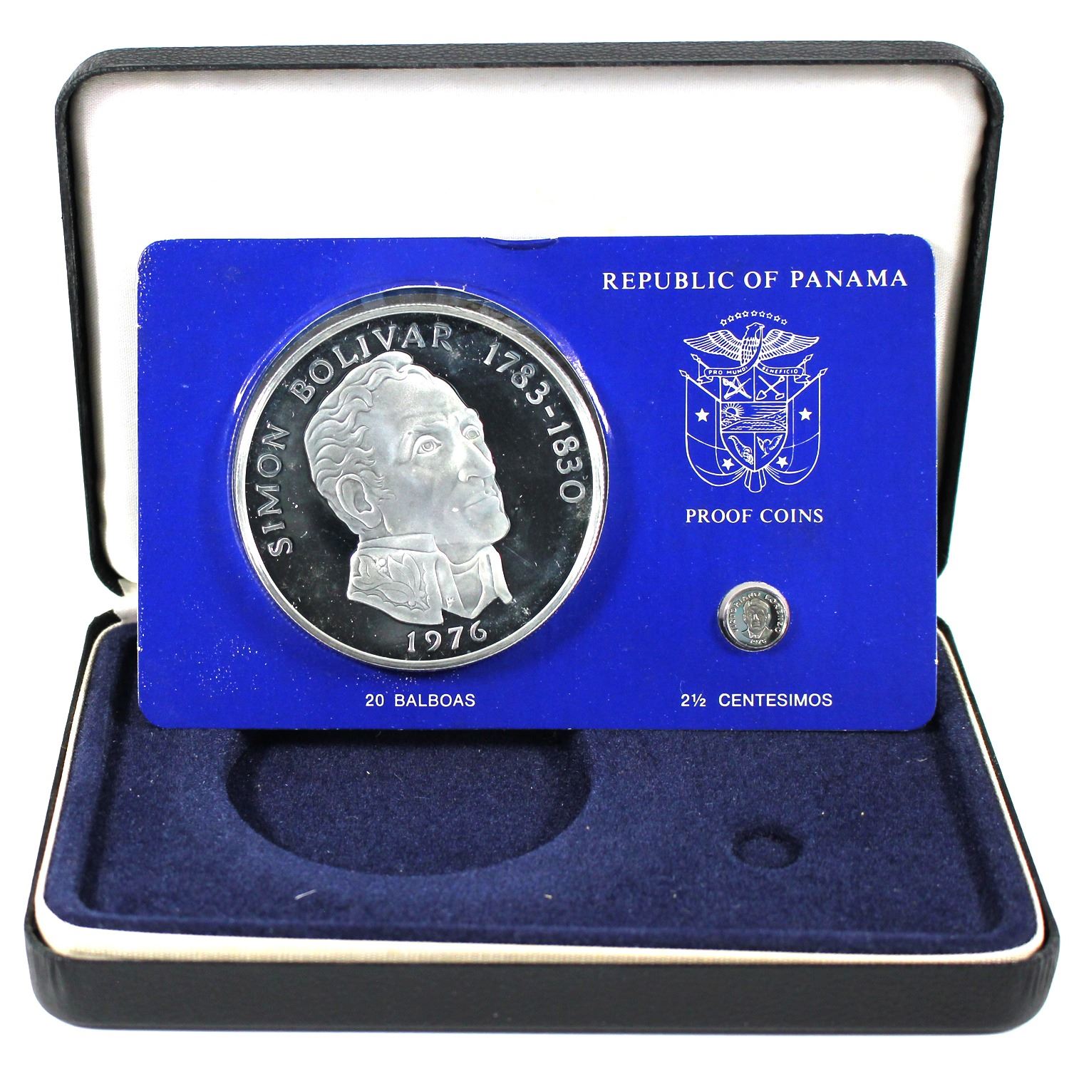 1976 Panama 2-Coin Proof Set. Minted by Franklin Mint. Lot Includes: 20 Balboas; & 2 1/2 Centesimos. Coins have been naturally toned.