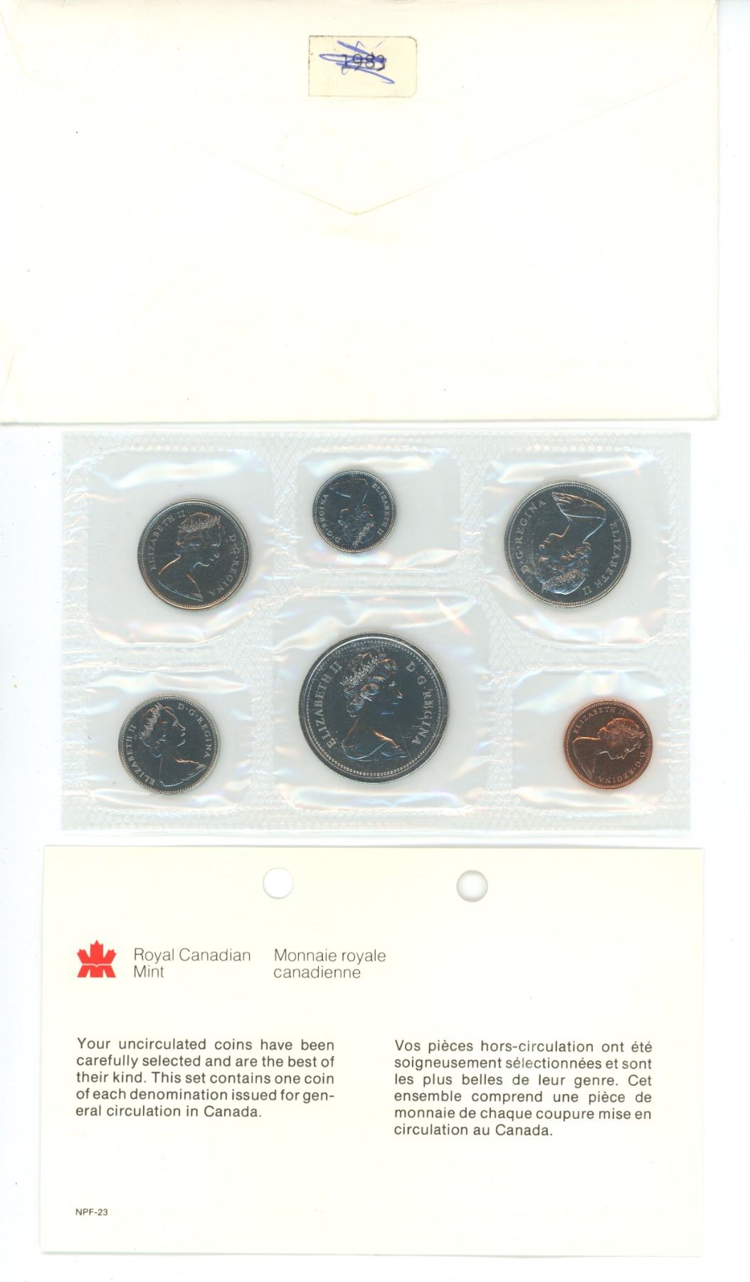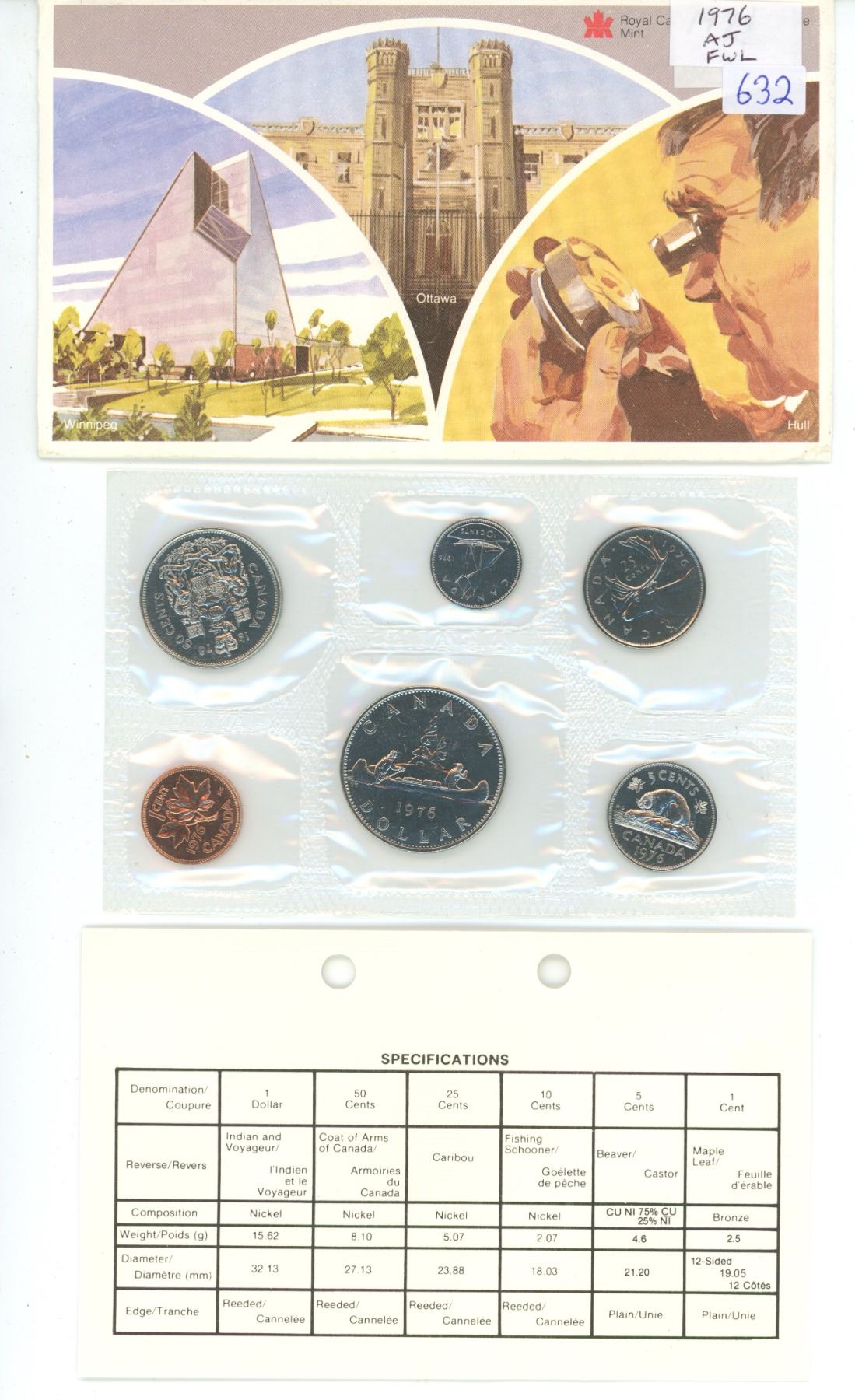 1976 Proof Like Set. 6-coin set as issued by the Royal Canadian Mint. The dollar as Attached Jewel with Full Water Lines in front of canoe.