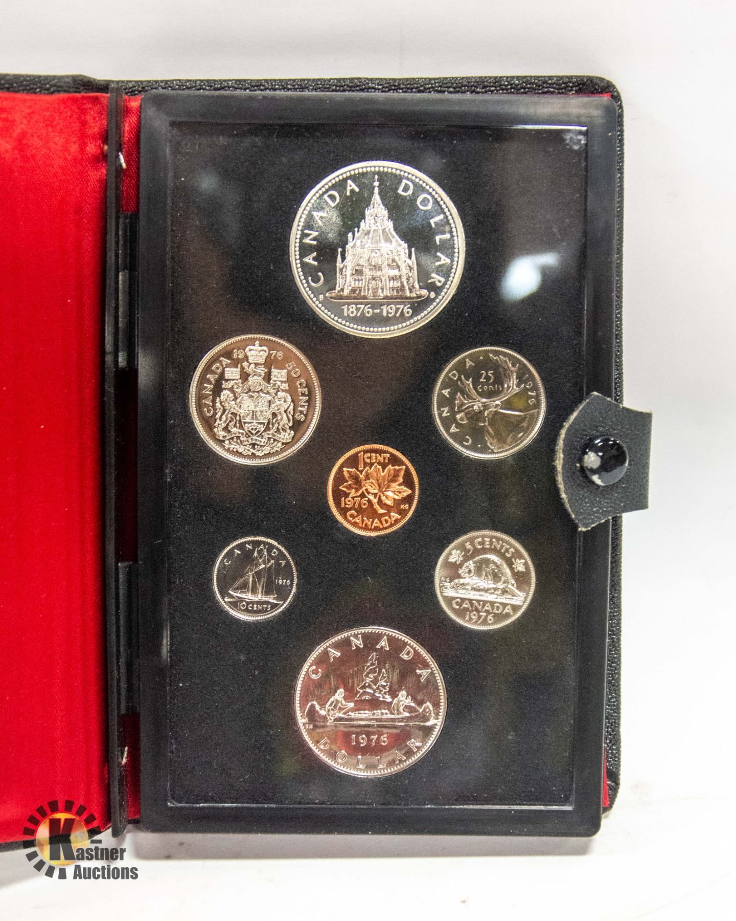 SEVEN COIN PRESTIGE SET WITH ONE COMMEMORATIVE SILVER DOLLAR. CREST OF CANADA, BLACK LEATHER BOX BOOK TYPE WITH CLASP. RED SATIN INSIDE VOYAGEUR/PARLIAMENT. **ALL ITEMS MUST BE REMOVED BY 5PM SATURDAY, FEBRUARY 17TH 2024. ALL REMAINING ITEMS WILL BE SUBJECT TO A $6.00 PER DAY STORAGE CHARGE. ANY ITEMS REMAINING AFTER MONDAY, MARCH 4TH, 2023 WILL BE CONSIDERED FORFEITED. NO REFUNDS WILL BE ISSUED FOR FORFEITED ITEMS. TO SCHEDULE A PICK UP APPOINTMENT CLICK HERE
