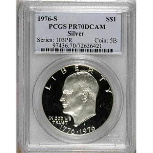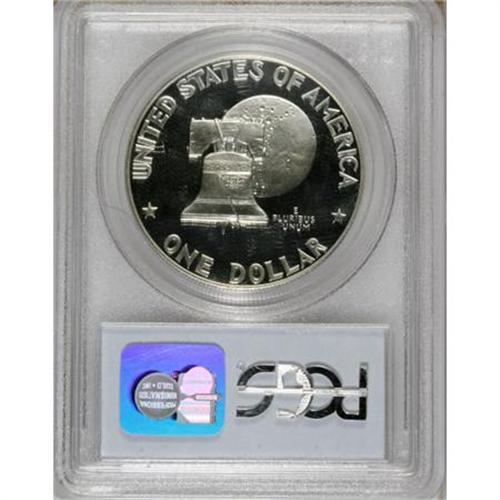 <B>1976-S $1 Silver PR70 Deep Cameo PCGS.</B></I> A stunning white-on-black Bicentennial dollar. The obverse is completely untoned, while the reverse displays just the slightest hint of incipient gold color around the borders under magnification. An exquisite strike leaves crisp delineation on the design features, and close scrutiny reveals unimprovable surfaces. Population: 11 in 70 Deep Cameo (4/07).<BR><BR><b>Shipping:</b> Coins & Currency (<a target="_blank" href="http://www.heritageauctions.com/common/shipping.php">view shipping information</a>)