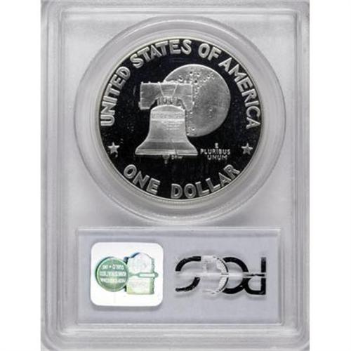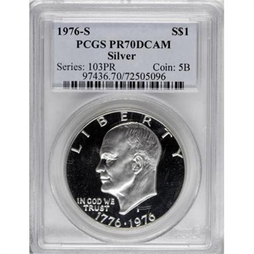 <B>1976-S $1 Silver PR70 Deep Cameo PCGS.</B></I> This is the Variety One design, as are all silver proofs of this date. In 1975 and 1976 (all dated 1976), special commemorative reverse designs were prepared for the three largest denominations, each emblematic of our national independence. The silver dollar carried a depiction of the Liberty Bell, with the moon in the background. This piece is a perfect proof example, one of a few that are so certified by PCGS. Population: 14 in 70 Deep Cameo, 0 finer (12/07).<BR><BR><b>Shipping:</b> Coins & Currency (<a target="_blank" href="http://www.heritageauctions.com/common/shipping.php">view shipping information</a>)