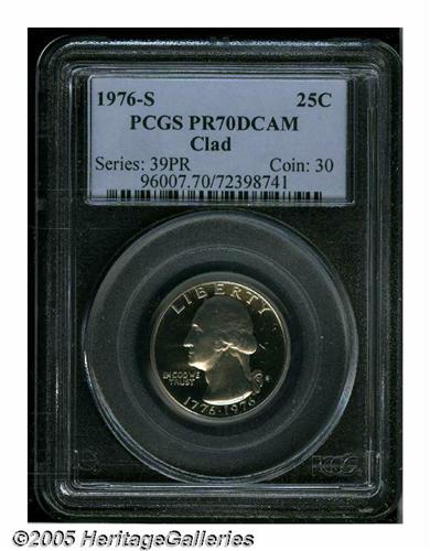 <B>1976-S<25C> Clad PR70 Deep Cameo PCGS.</B></I> A magnificent Bicentennial specimen that has frosty devices and impressively mirrored fields. Population: 62 in 70 (5/05).