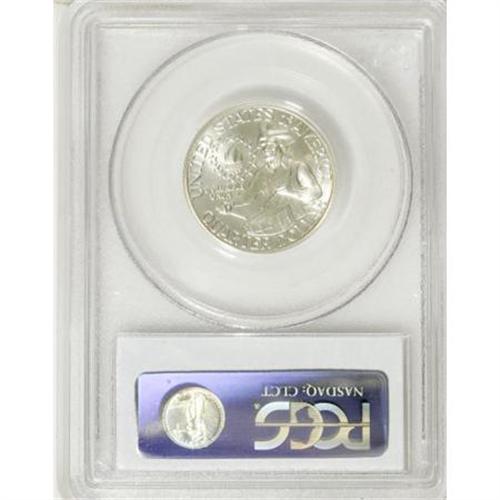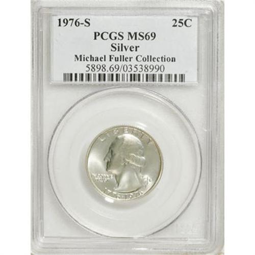 <B>1976-S 25C Silver MS69 PCGS.</B></I> Even under magnification, the exquisite preservation of this modern silver clad piece is highly impressive. The subtlest hints of champagne patina grace the obverse, while the reverse is essentially untoned. Though the net mintage for the 1976-S silver clad business strike is speculative, its rarity in MS69 is undeniable. Population: 2 in 69, 0 finer (10/07).<BR><I>From The Michael Fuller Collection.</B></I><BR><BR><B>Coin Engraver:</B> John Flanagan<BR><BR><b>Shipping:</b> Coins & Currency (<a target="_blank" href="http://www.heritageauctions.com/common/shipping.php">view shipping information</a>)