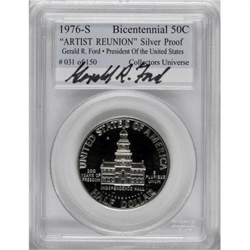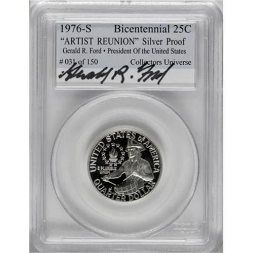 <B>1976-S Bicentennial Silver Proof Set PCGS. All three holders have an insert autographed by President Gerald R. Ford. </B></I>This "Artist Reunion" set includes a proof 40% silver Bicentennial quarter, half, and dollar.<BR><BR><B>Coin Engraver:</B> John Flanagan<BR><BR><b>Shipping:</b> Coins & Currency (<a target="_blank" href="http://www.heritageauctions.com/common/shipping.php">view shipping information</a>)