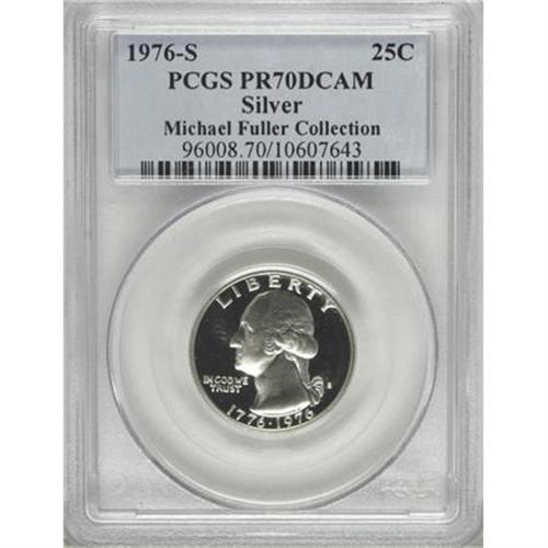 <B>1976-S 25C Silver PR70 Deep Cameo PCGS.</B></I> This white-on-black 40% silver Bicentennial quarter is brilliant and immaculate. An unimprovable representative of this popular and briefly issued commemorative type. Population: 18 in 70 Deep Cameo. (10/07).<BR><I>From The Michael Fuller Collection.</B></I><BR><BR><b>Shipping:</b> Coins & Currency (<a target="_blank" href="http://www.heritageauctions.com/common/shipping.php">view shipping information</a>)