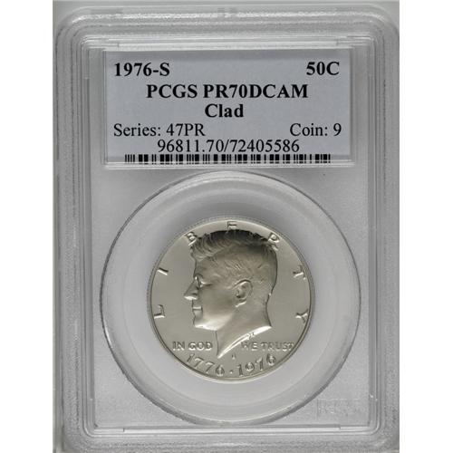 <B>1976-S<50C> Clad PR70 Deep Cameo PCGS.</B></I> A delightful coin in every way, with boldly frosted lettering and devices and the expected quality of surfaces for the grade. No toning has formed. Rare thus, and apparently one of the absolute finest yet seen by PCGS. Population: 16 in 70, 0 finer (3/06).<BR><I>From The J. S. Hamilton Registry Set of Proof Kennedy Half Dollars.</B></I> <BR><BR><B>Important notice:</B> Heritage usually auctions material at the rate of 200-250 lots per hour. On some occasions eBay Live bid software or the Internet may not be able to keep up with the pace of the auction. We recommend placing a realistic absentee bid now as insurance to avoid disappointment. Occasionally the auctioneer may eliminate or reject an eBay Live bid, and the auctioneer may also reopen a lot after the close of the eBay live bidding (usually because we missed an audience bid), and may reject your bid even if it shows you as the winning bidder. By bidding via eBay Live, you agree that Heritage may award the lot to another bidder at its sole discretion under the circumstances described above or any other reasonable circumstances. Since eBay bids are not shown to us until we open the lot on the floor, we treat those bids just like floor bids. In most cases the floor responds before the eBay bid is presented to us, due to Internet lag time, so for consistency we have made it a policy that floor bids are always considered first over tie eBay live bids. Also please note that all Heritage lots purchased through eBay Live carry a 20% Buyer's Premium. Please make sure you read the Terms and Conditions before you bid. This lot is being auctioned in conjunction with a live floor auction by Heritage Galleries & Auctioneers. All final auction and invoice information will be supplied by Heritage Galleries & Auctioneers, and all other information should be considered preliminary. Lot:3176 <BR><BR><B>Winning Notification and Billing:</B> After the FINAL session in this auction is complete, Heritage will send e-mail and snail mail invoices. This process normally takes several days. All final auction and invoice information will be supplied by Heritage Galleries & Auctioneers, and all other information should be considered preliminary. <BR><BR>This auction will be conducted on a live auction floor and over the Internet through eBay Live. If you choose to place an absentee bid, please take a moment to <font color='#0000ff'><u><a href='http://pages.ebay.com/liveauctions/help/before/laabsentee.html'>learn how eBay Live absentee bidding works</a></u></font><font color='#000000'>